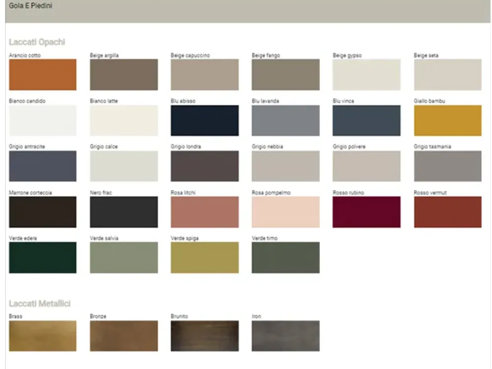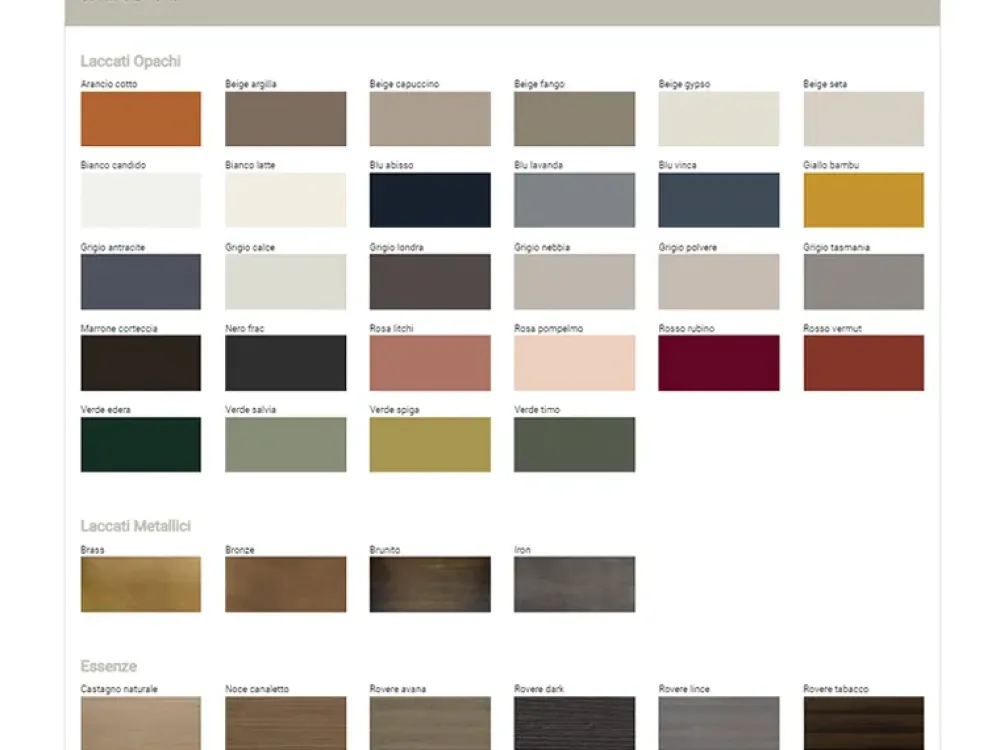Disponibile in laccato opaco, essenza, laccato metallico con gola e piedini in laccato opaco o laccato metallico.