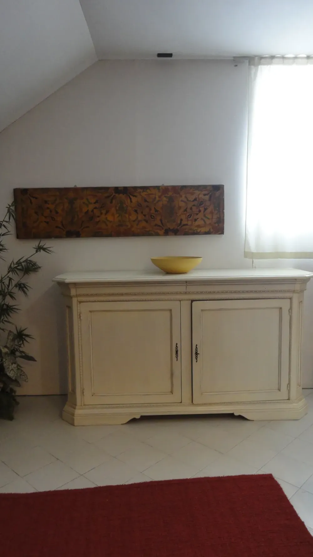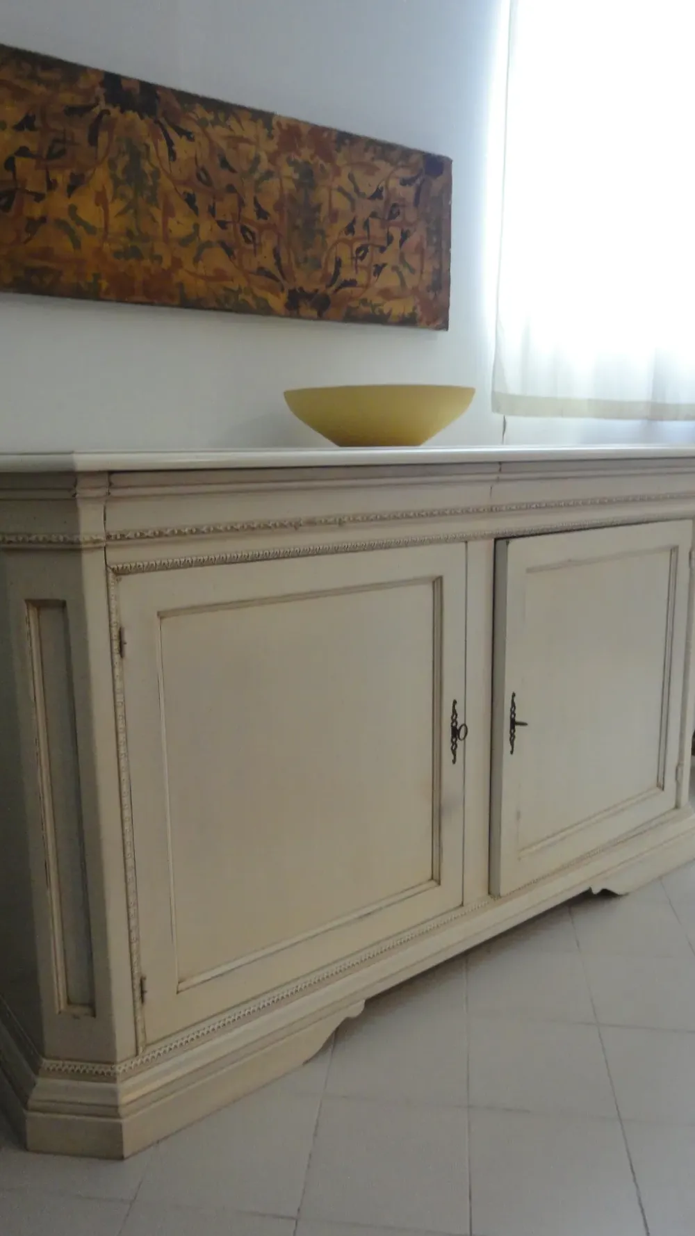 La credenza è in legno massello in finitura patinato bianco, ed è composta da due ante ad apertura battente.