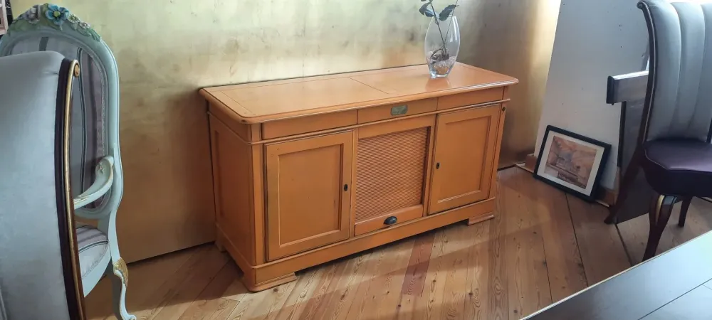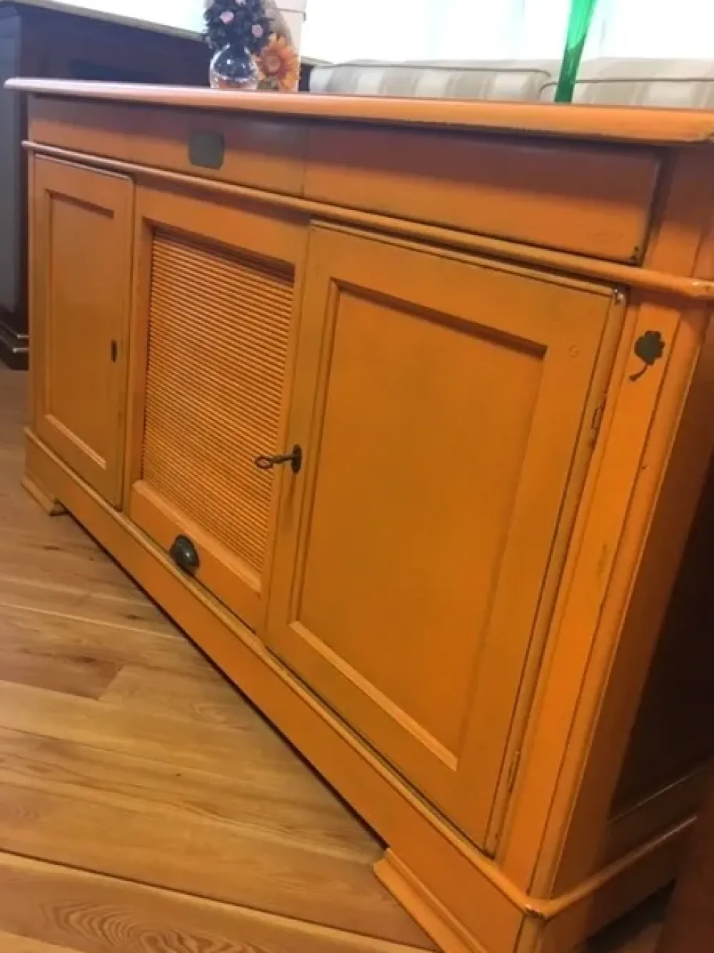 Credenzina Porta TV in legno massiccio 146*48*76 h a 2 ante + serrandina centrale +3 cassetti push-pull+ cassetto segreto nello zoccolo .