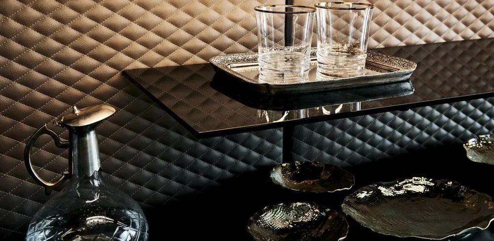 Madia con struttura e piedi in acciaio verniciato goffrato nero (GFM73), ante e fianchi in cristallo fumè con fasce in cristallo verniciato nero. Top e fondo in cristallo verniciato nero acidato, schienale interno in ecopelle o pelle trapuntata come da campionario. Ripiano interno in cristallo fumè. Illuminazione a led inclusa.
