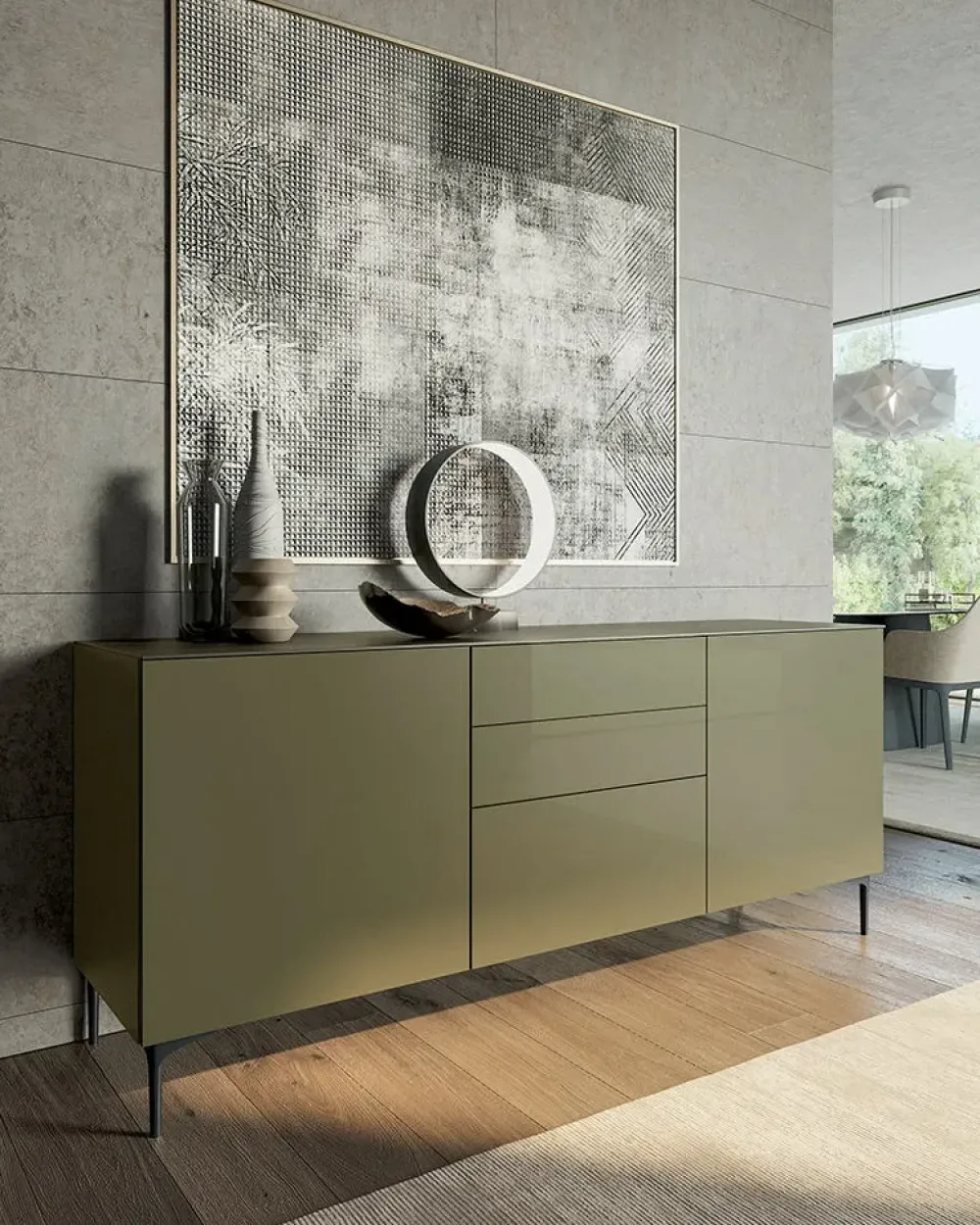 La madia modello Slim qui visibile saprà arricchire il tuo soggiorno sottolineando le doti estetiche del locale: questo mobile in laccato opaco ti consentirà di avere sempre a disposizione un piano d’appoggio multifunzionale, esaltando allo stesso tempo lo stile moderno del soggiorno.