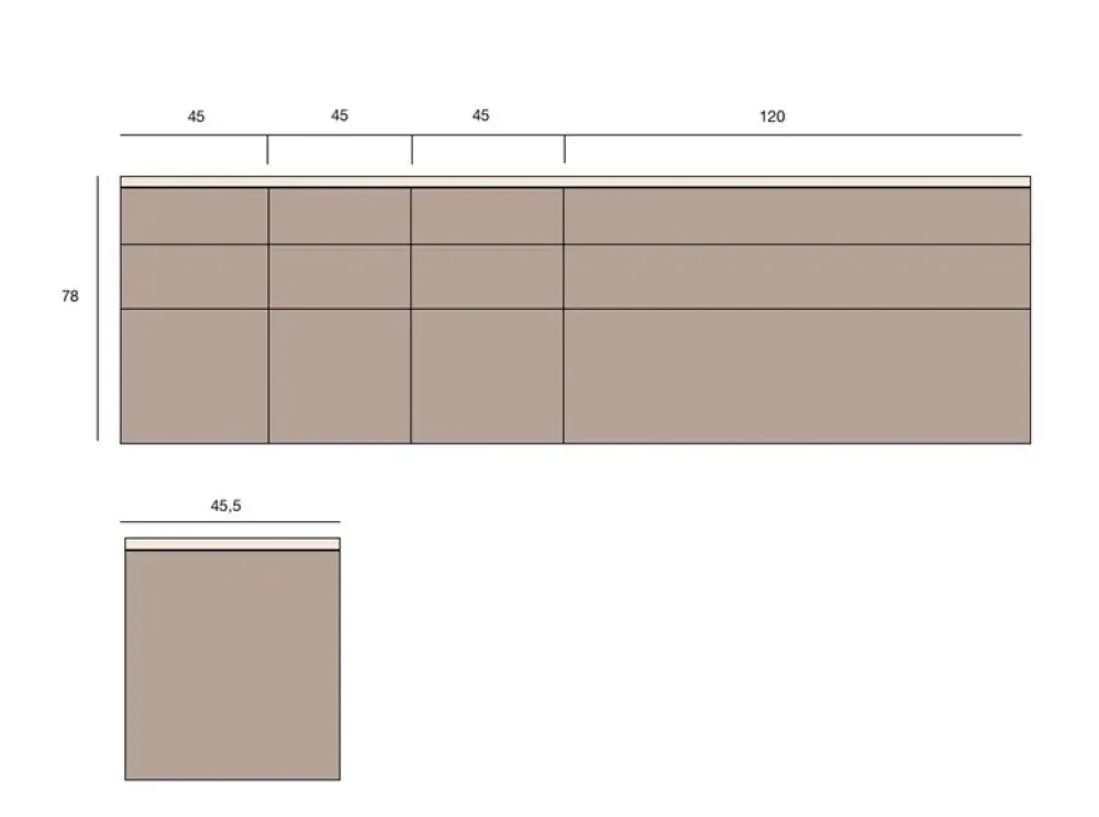 Per esaltarne la sua forma pulita, viene proposta in offerta Outlet nella delicata finitura in melamminico di alta qualità COLOR SABBIA con top in contrasto in finitura NOCE NATURALE.