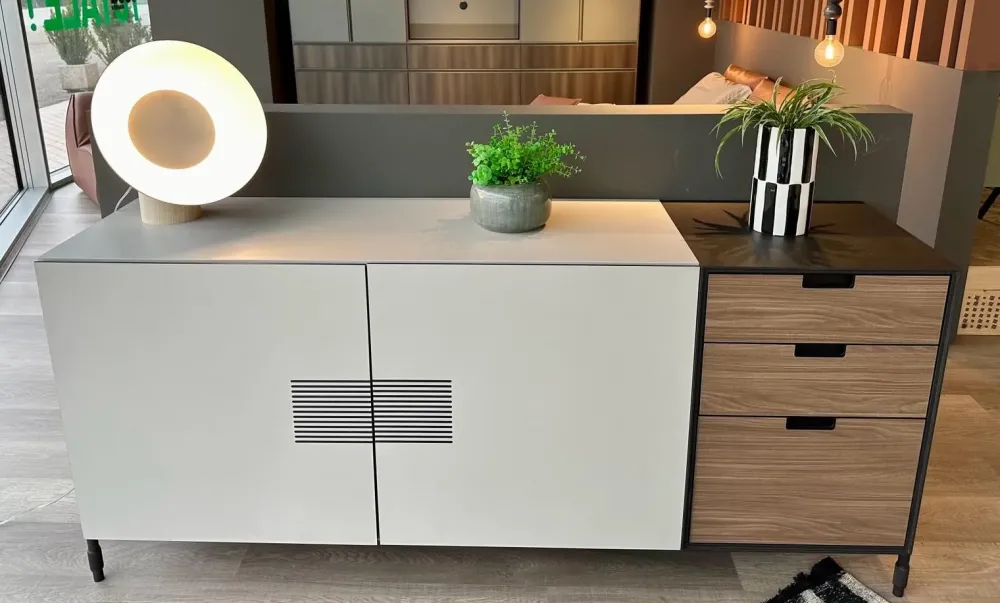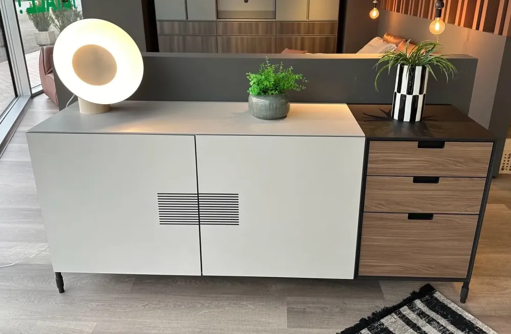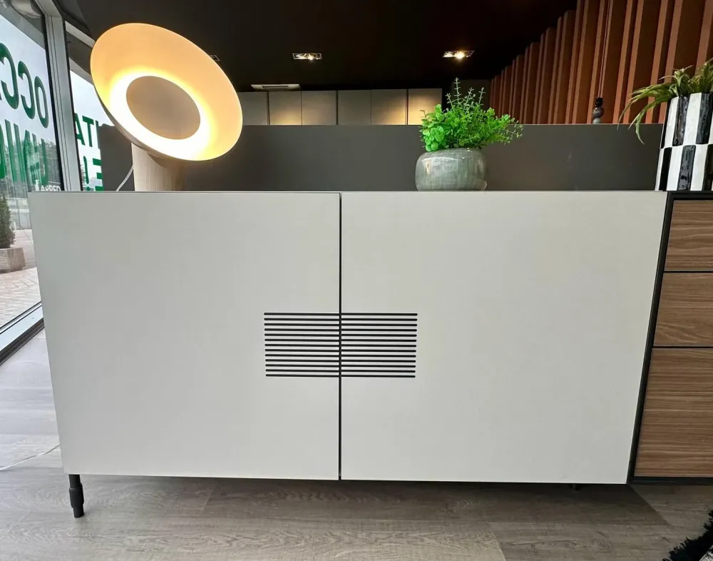 Le madie e i mobili per il soggiorno, come il modello Time unit _ ti 106 presente in foto, sono fondamentali sia dal punto di vista estetico che per quanto concerne la funzionalità: potrai riporci libri, oggetti d’uso quotidiano o propriamente decorativo. La madia in laminato materico nell’immagine unisce le doti di praticità e design del locale dando vita a un concept d’arredo design.