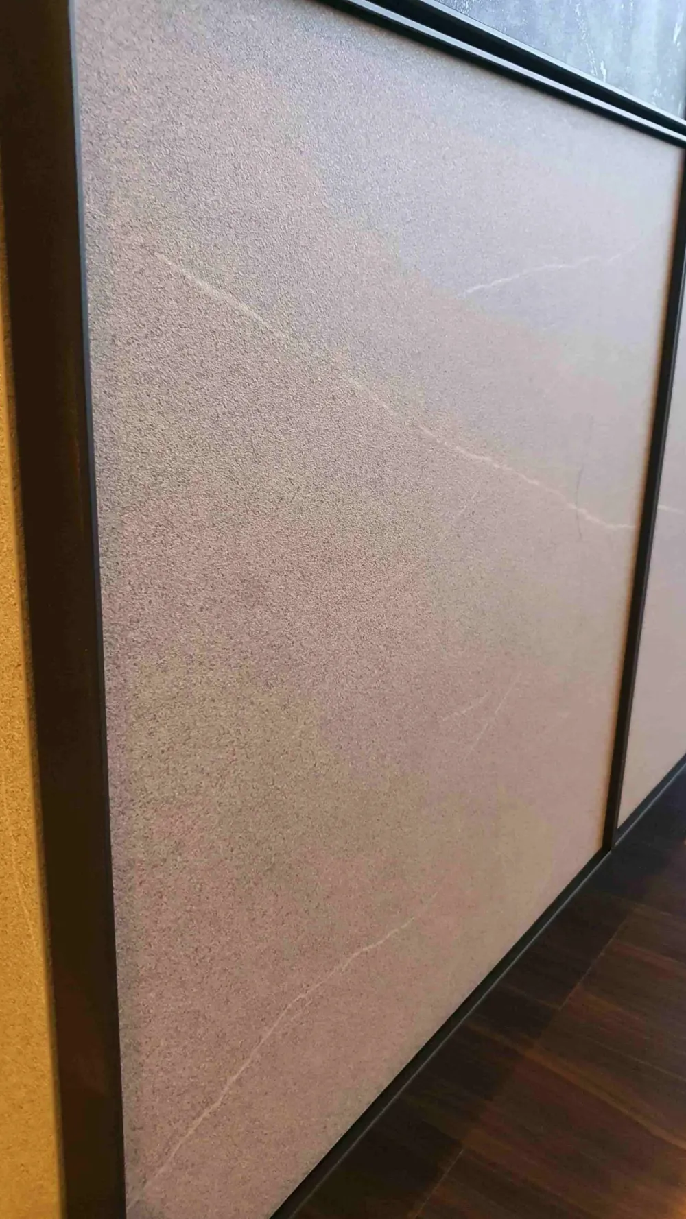 La finitura è in materico PIETRA PIASENTINA con i tre frontali dei cassetti in finitura ,aterico CEMENTO SCURO. Il basamento è in metallo laccato colore antracite come il profilo delle ante