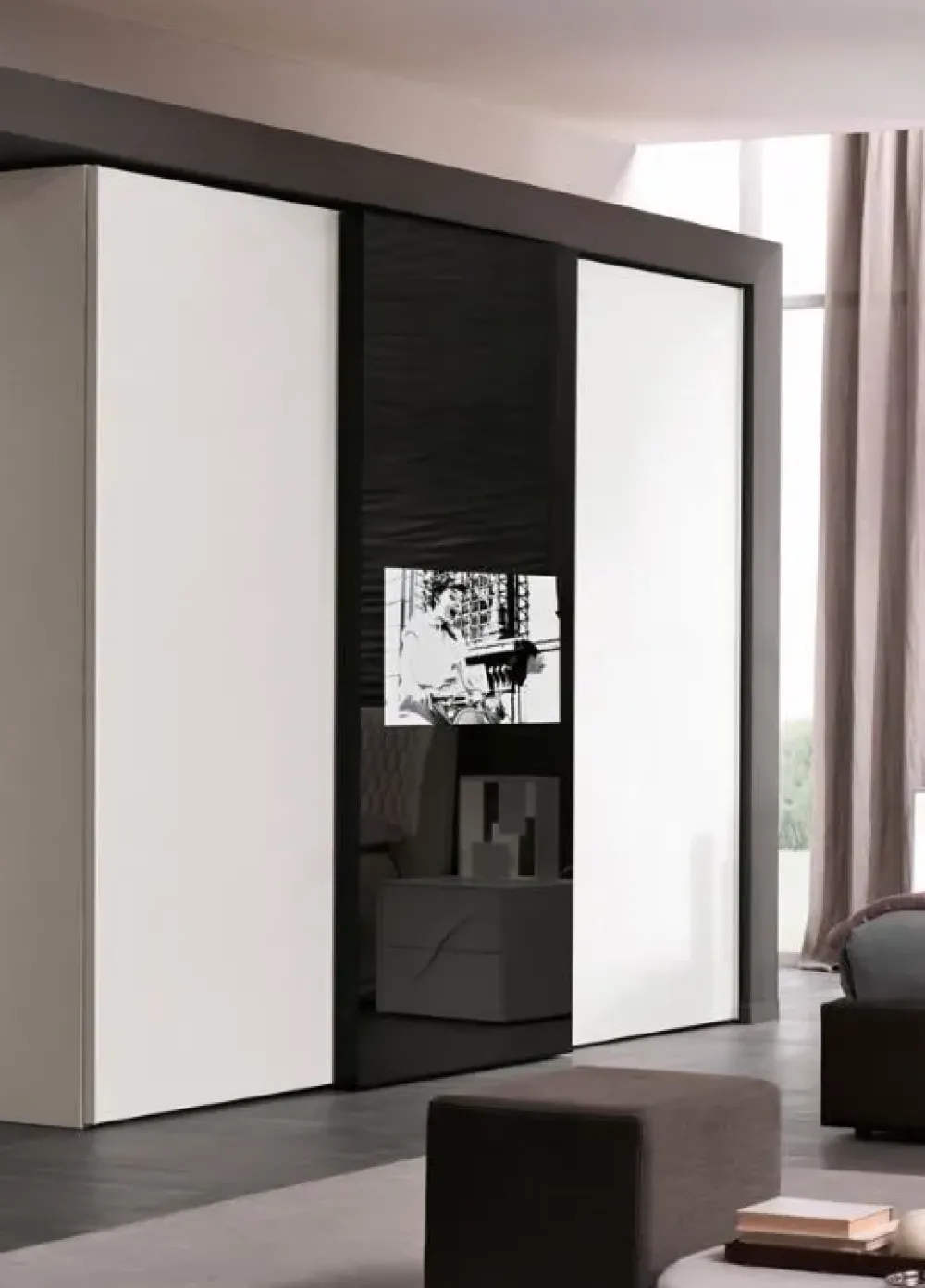 L’armadio 2 ante scorrevoli laterali in frassino bianco, quella centrale in finitura specchio. Finitura interna in grigio chiaro. Anta centrale predisposta per Tv: