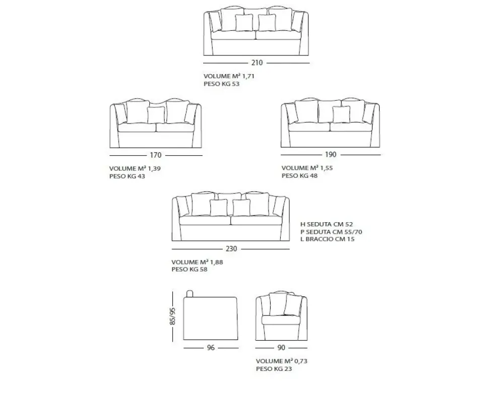 - Gli arredi, tra cui anche gli imbottiti, non devono mai essere d’ingombro, soprattutto per quanto riguarda lo spazio che occupano all’interno dei locali; difatti è fondamentale valutare con cura anche le loro misure: il modello di Divano visibile in foto appartiene alla collezione di imbotti della firma di lunghezza che varia da 201 a 225 cm ed è quindi ideale per un locale di molteplici misure.
