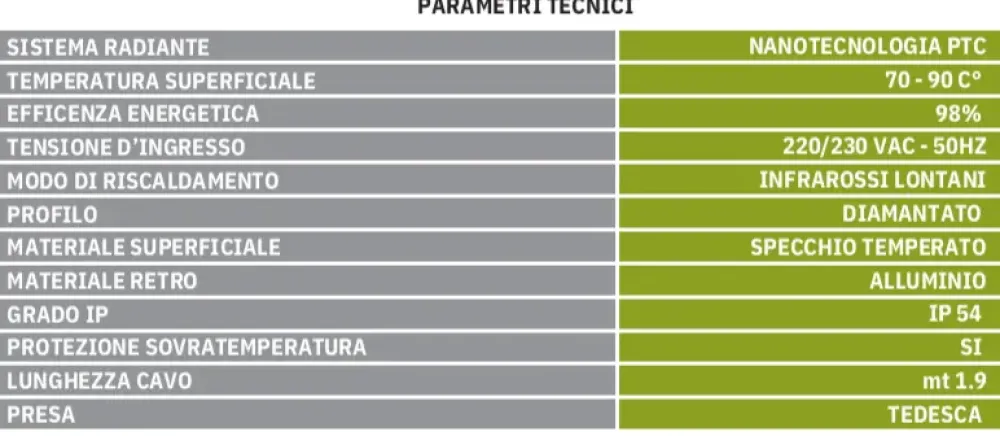 I Specchi radianti sono un’elegante soluzione riscaldante, costituiti essenzialmente da un involucro di alluminio ad alta reciclabilità, al cui interno è installata la tecnologia unica e brevettata. Il ridotto spessore dell’elemento radiante, che fa corpo unico con il guscio metallico conduttivo, garantiscono un’eccellente diffusione del calore e un’ottima efficienza energetica in grado di scaldare ed illuminare aree chiuse, dai 6 ai 14 m2 con un unico pannello*. La sua forma piatta e lineare ne fanno un elegante termo arredo di design adatto a tutti gli ambienti, dal salotto al bagno, dalla sala da pranzo alle camere da letto. Con il suo sistema a vibrazione molecolare radiante, che trasmette il calore in modo uniforme ad una frequenza distribuita tra i 9 e 11 Micron (Luce calda fisiologica), su tutta la superficie irraggiata, il pannello assicura una sensazione confortevole, senza generare stratificazione dell’aria. L’irraggiamento termico, a differenza della convezione termica che scalda e muove l’aria, o della conduzione termica che scalda per contatto, è come il calore del sole: riscalda oggetti e persone all’interno di un ambiente generando la miglior sensazione di benessere percepita dal corpo umano. L’ assenza di moti d’aria (e conseguentemente di polveri) e di emissioni elettromagnetiche crea un ambiente salubre e di assoluto comfort per le persone che lo vivono, anche in modo continuativo. Una delle sue caratteristiche dello specchio riscaldato fa si che non si appanni. La misura dello specchio orizzontale proposto è mis. 1200 x 600 x 44 mm. la seconda versione Specchio Verticale mis. 600 x 800 x 44 mm.
