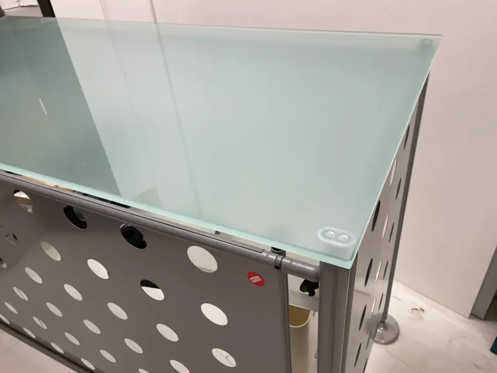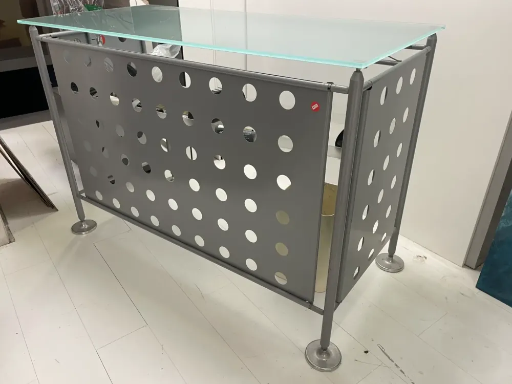 BANCONE REPTION IN METALLO COLORE ALLUMINIO CON PIANO SUPERIORE IN VETRO ACIDATO