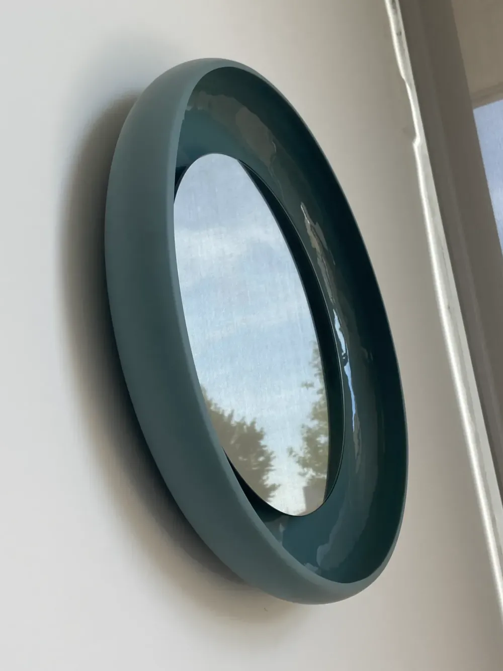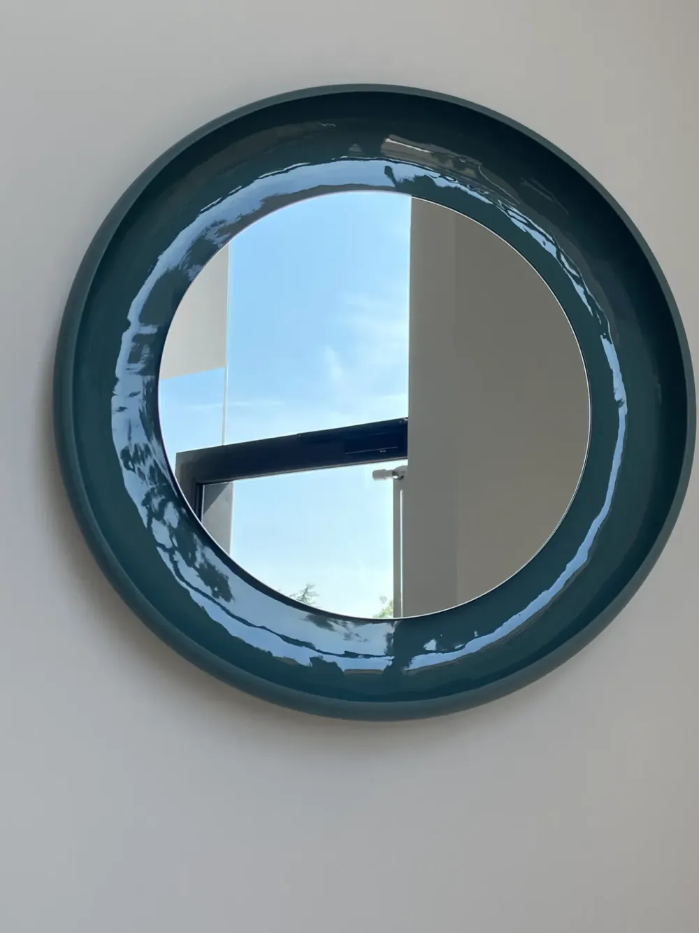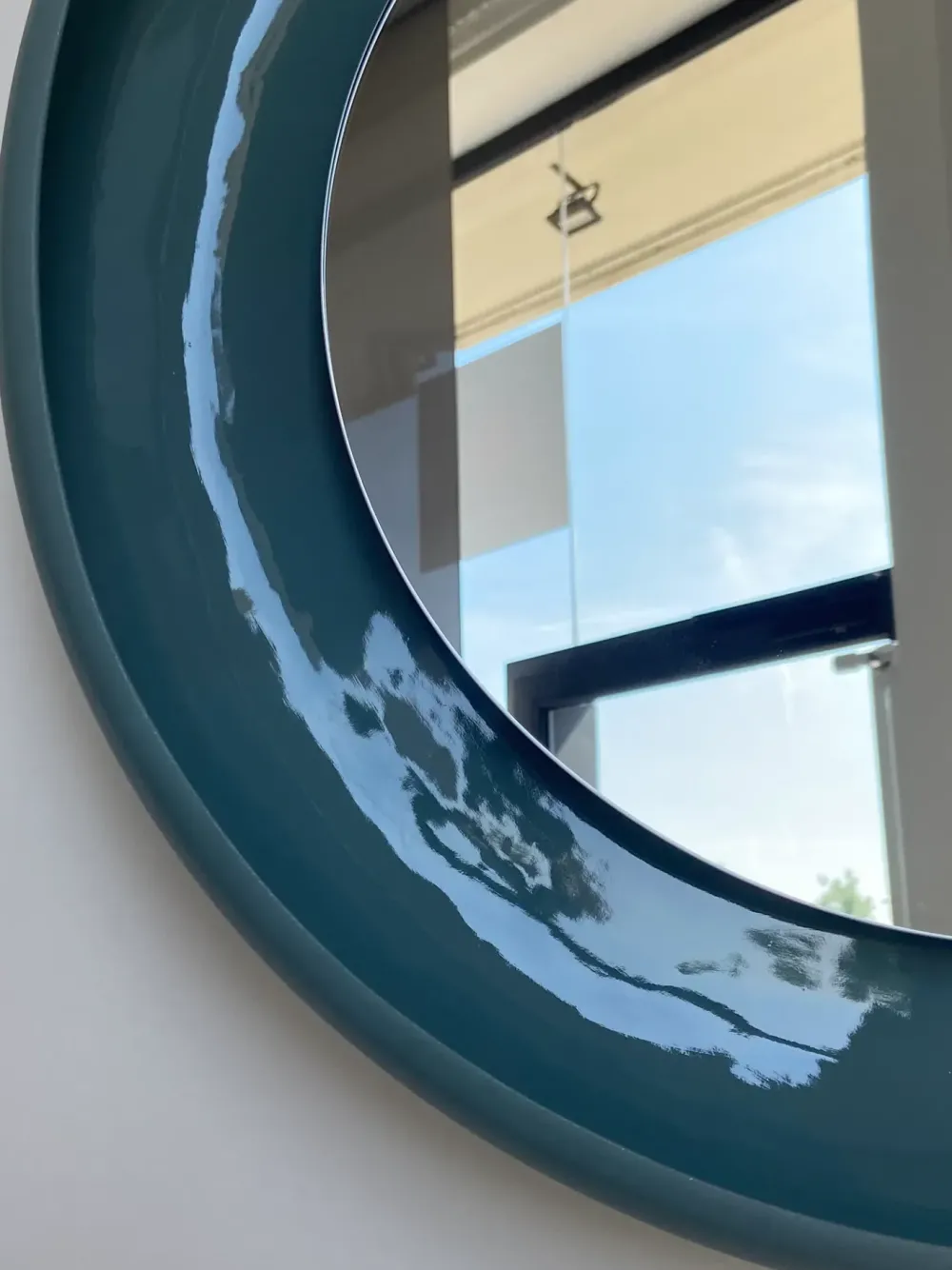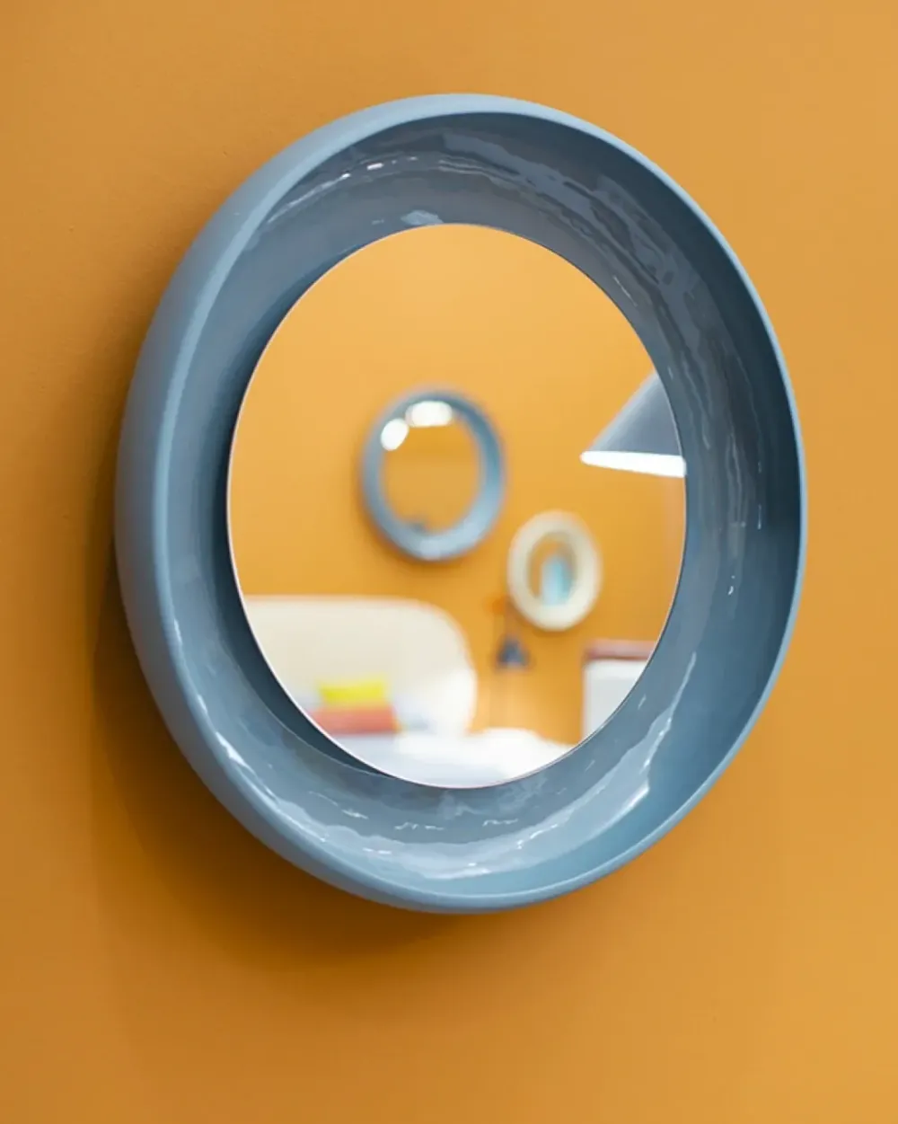 Lo specchio è in finitura azzurro Peltro e misura Ø65×10 cm e l’interno specchiante è Ø45 cm.