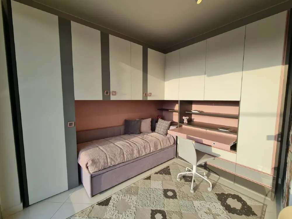 Composizione cameretta per bambini e o ragazzi , sviluppata su andamento angolare , composta da armadi alle estremità con scrivania integrata e sistema ponte.
