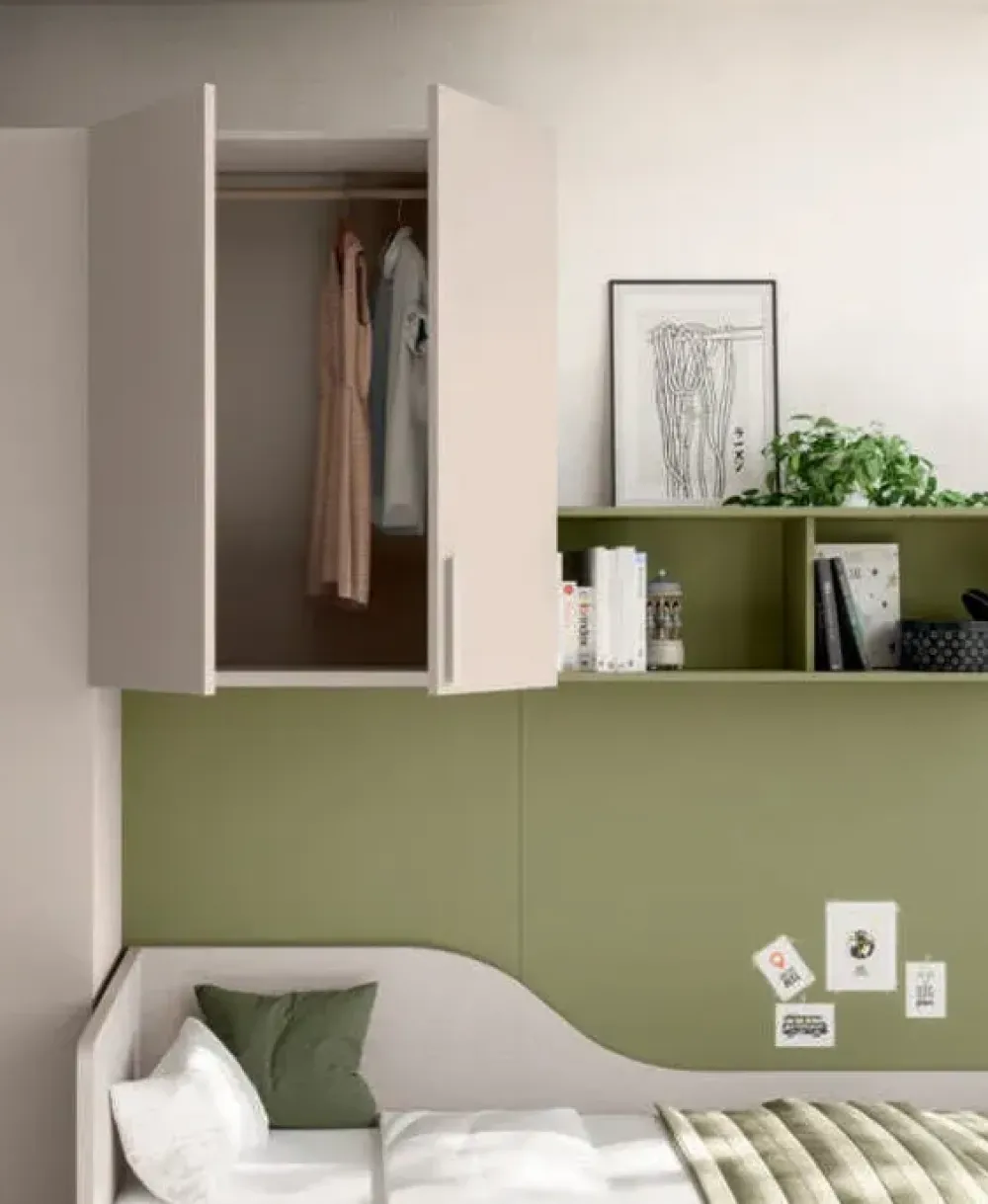 La cameretta prevede un divano letto singolo con vano a giorno, un armadio battente e ponte appeso. A completamento della composizione troviamo una libreria con box pensile a giorno, uno scrittoio con cassettiera su ruote e casellari e una sedia su ruote. (È escluso il materasso).