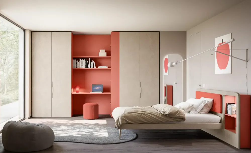 Per ricreare le atmosfere ideali per il regno dei giovani, prediligi camerette dalle tonalità più vivaci e dalle forme morbide, cosicché l’ambiente possa trasmettere vitalità e serenità; il brand ha optato per un materiale tanto pregiato quanto resistente per questa cameretta Cameretta letto a terra 02, vale a dire il laminato opaco, in modo da completare la resa estetica della stanza ultimandone pure le qualità pratiche.