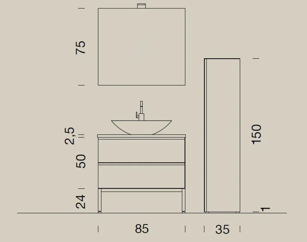 La base portalavabo, oltre alla misura base di 85 cm, è prevista anche nelle seguenti misure: 95 cm, 120 cm (per conoscere i relativi prezzi contattateci).