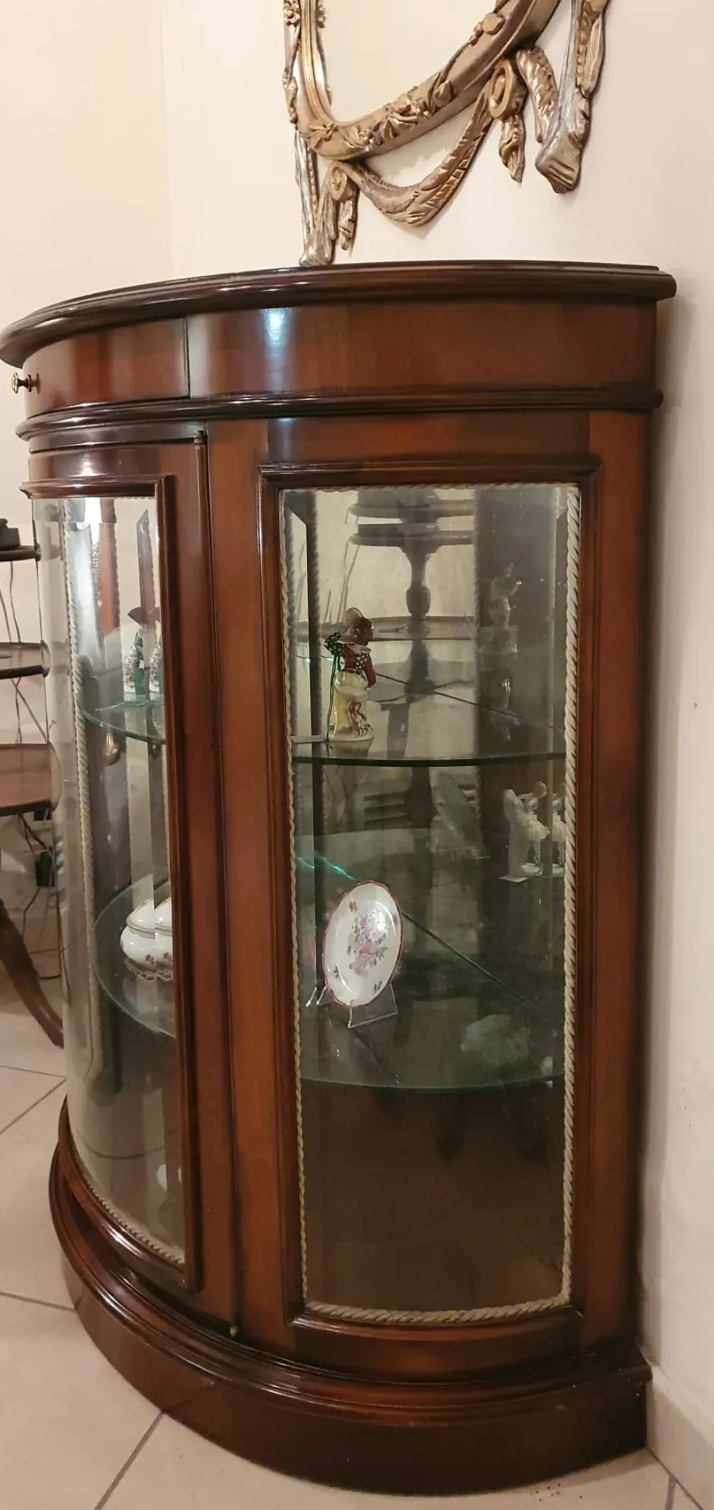 vetrinetta caratterizzata da un’anta a battente con vetro curvo con chiave, un cassetto superiore, due ripiani in vetro curvi e schienale con specchio.