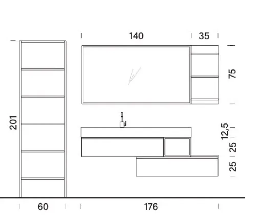 Dimensioni composizione: L 60+176 x P 50/51/13 cm (vedi disegno).