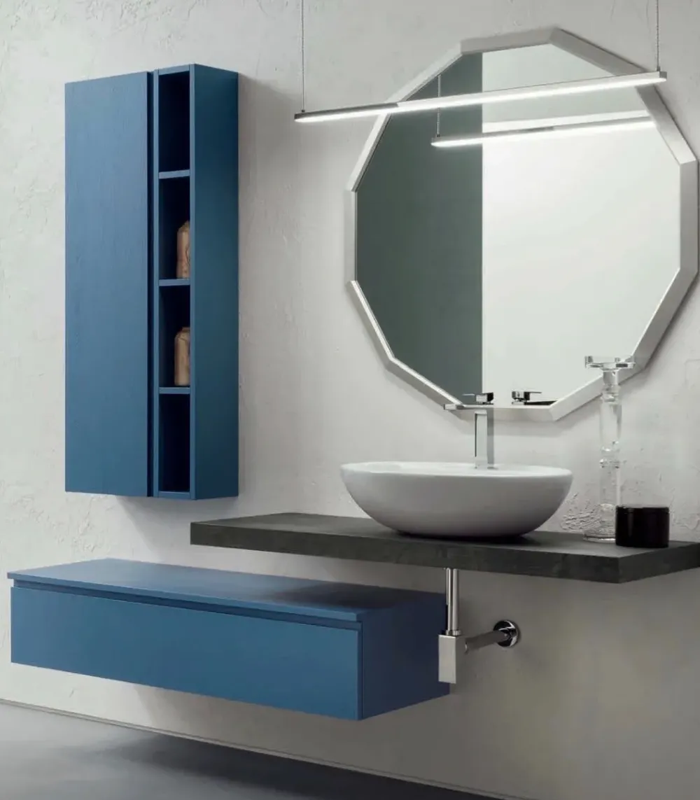 - Con il fine di poter far fronte a diverse esigenze abitative, il marchio ha ideato una collezione di arredi di diverse tipologie per la stanza da bagno; il modello mostrato in foto è un mobile sospeso, plurifunzionale e spazioso.