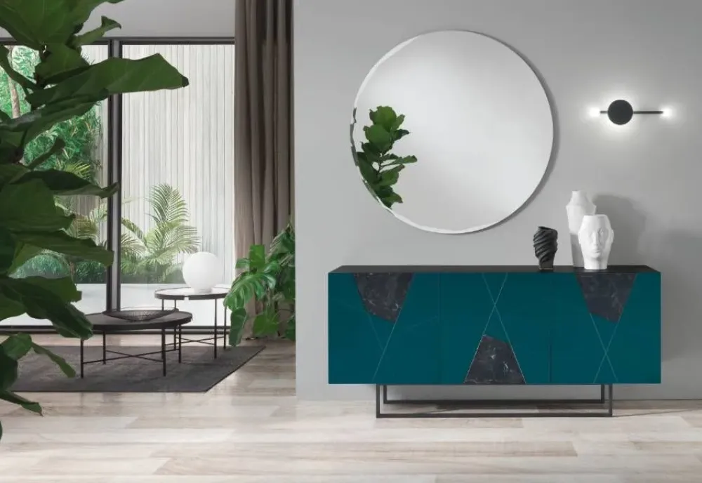 Le madie e i mobili per il living, come il modello Adel visibile in foto, sono essenziali sia dal punto di vista estetico che per la funzionalità: potrai riporci riviste, oggetti d’uso quotidiano o tipicamente decorativo. La madia in laminato materico nell’immagine unisce le doti di praticità e design dell’ambiente dando vita a un concept d’arredo design.