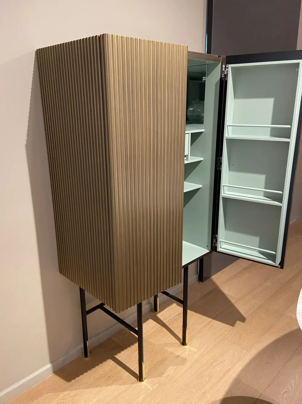 Aero è un elegantissimo mobile bar a due ante con finitura ottone vintage ed interni salvia. I colori e la trama verticale rendono questa elegantissima madia una reinterpretazione in chiave moderna dei mobili bar anni ’30. La struttura interna è pratica e contenitiva e permette di posizionare con grande agio bottiglie, vassoi e bicchiere di qualsiasi dimensione. Un articolo perfetto per stupire, con eleganza e praticità, i vostri ospiti. dimensioni: Larghezza 73 cm – altezza 152 cm – profondità 45,5 cm