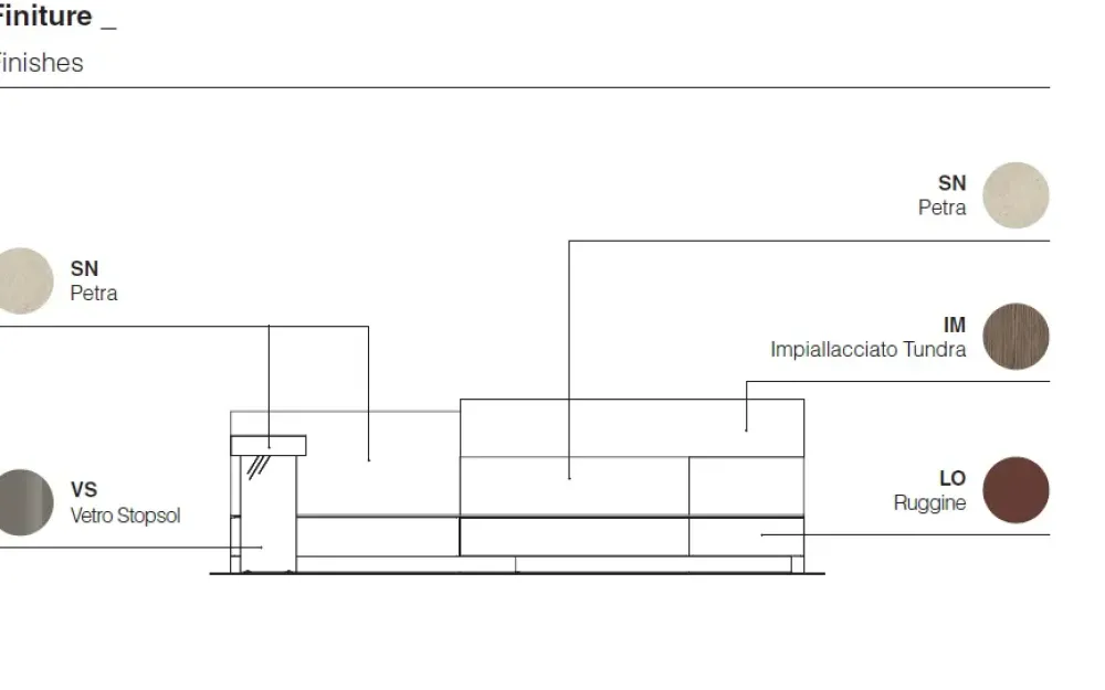 Soluzione proposta in Laccato opaco ruggine, vetro, impiallacciato tundra, e materico petra.