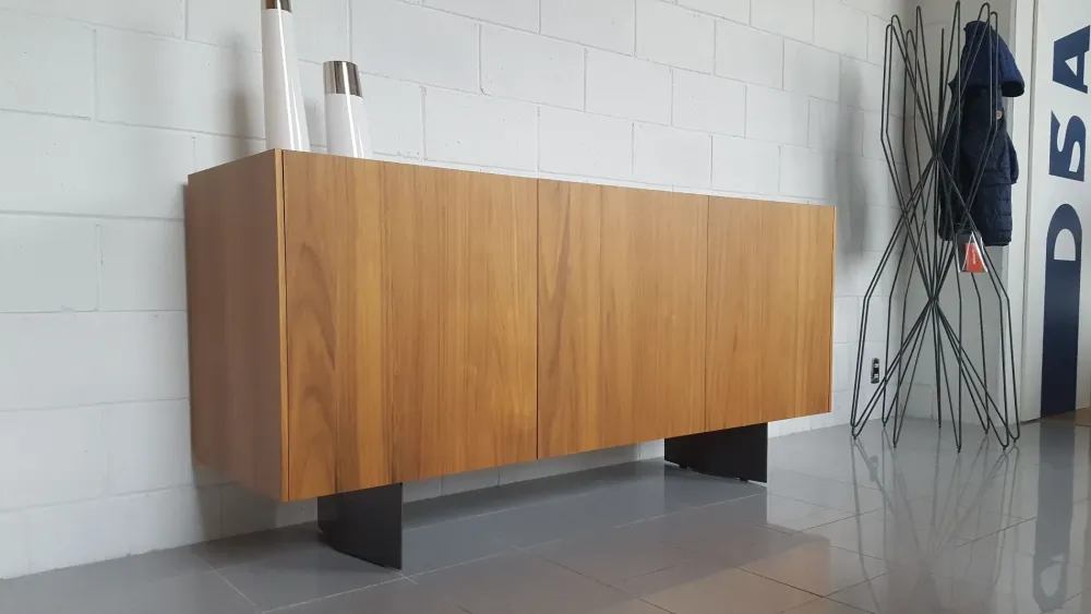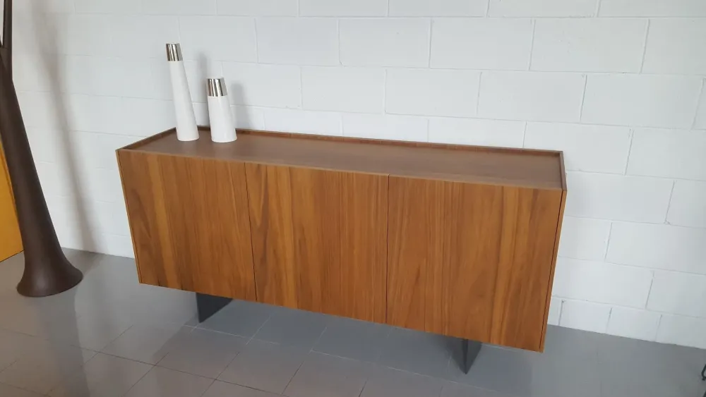 Credenza con struttura in legno impiallacciato noce canaletto e base verniciata grigio antracite. Dimensioni: 180 cm x 50 cm x h. 83 cm. Esposta in nostro show room, pronta consegna.