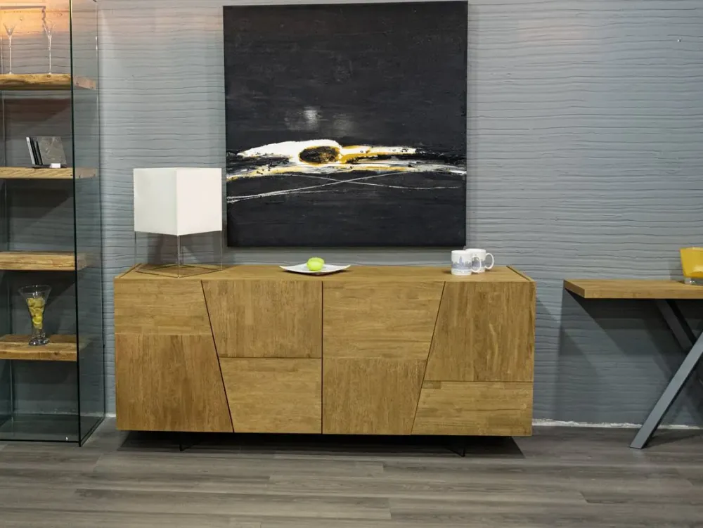 La madia modello Trapeze qui visibile saprà completare il tuo soggiorno sottolineando il valore estetico dell’ambiente: questo mobile in legno ti consentirà di avere sempre a disposizione una superficie di appoggio plurifunzionale, esaltando allo stesso tempo lo stile moderno del soggiorno.