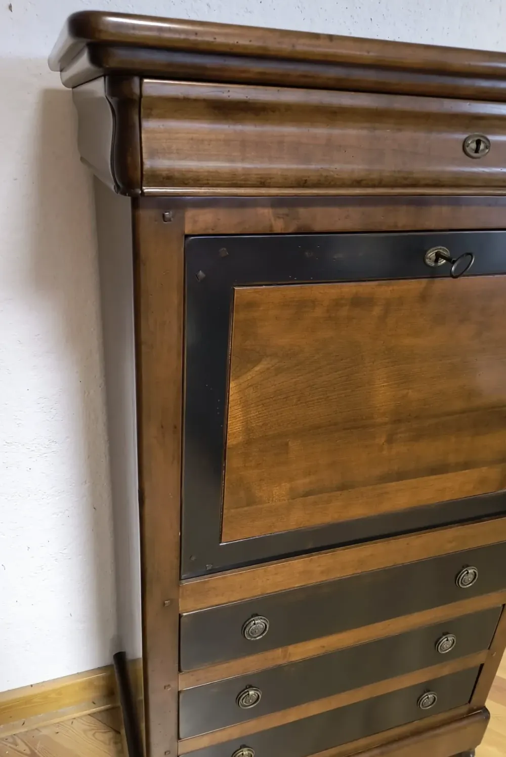 Secrétaire artigianale in legno massiccio di ciliegio Finitura noce antiquariato e dettagli laccati liquerizia