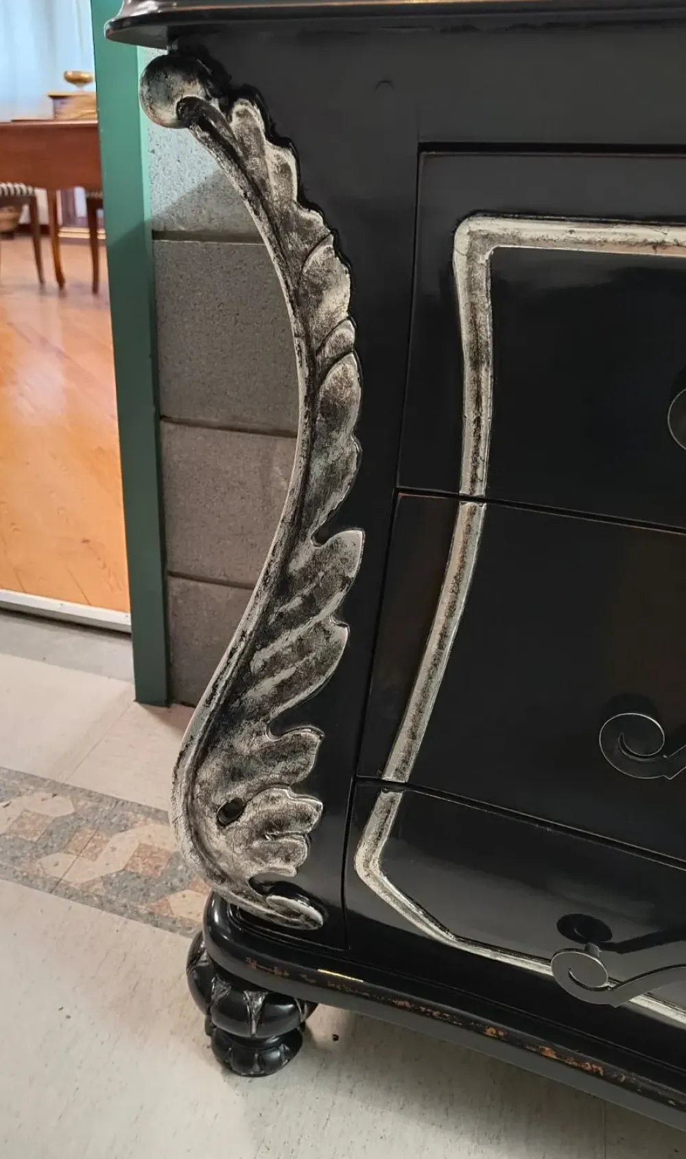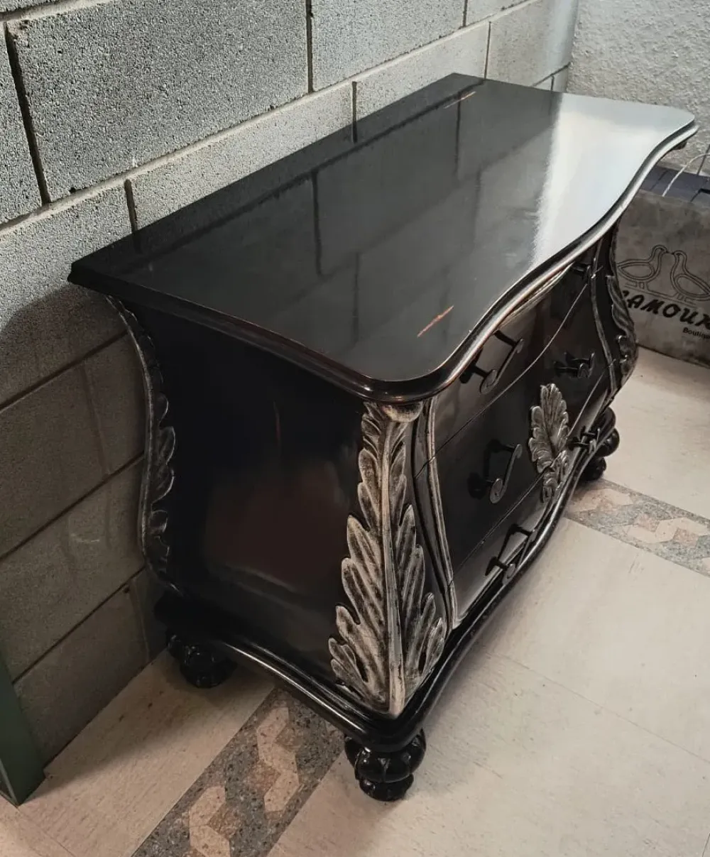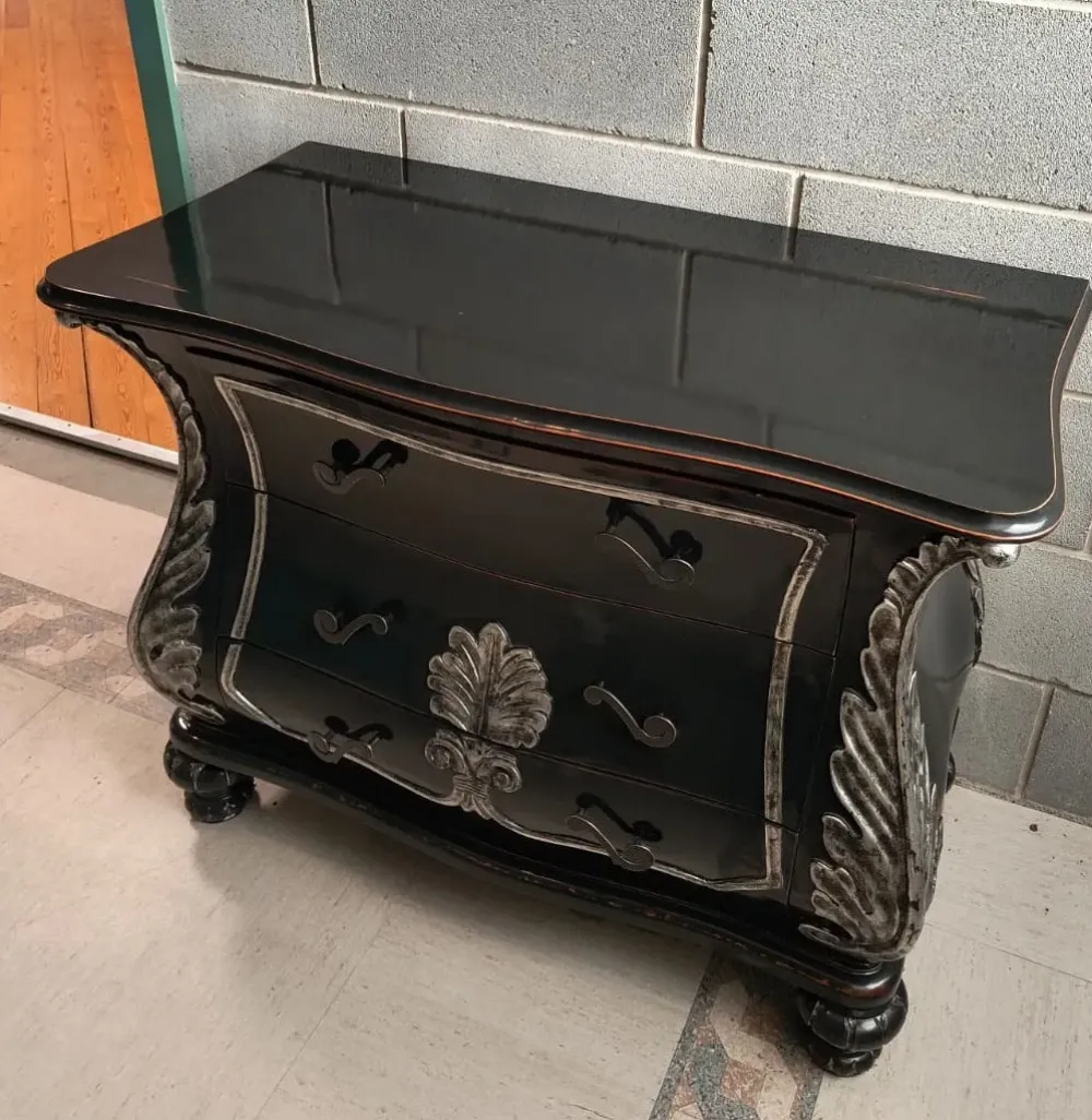 Un pezzo unico di alta artigianalità, questo mobile da ingresso è interamente realizzato in legno massello e intagliato a mano, espressione autentica della maestria artigiana italiana. La raffinata finitura laccata color liquerizia, abbinata ai dettagli in foglia argento patinata, dona un tocco di eleganza sofisticata e senza tempo.