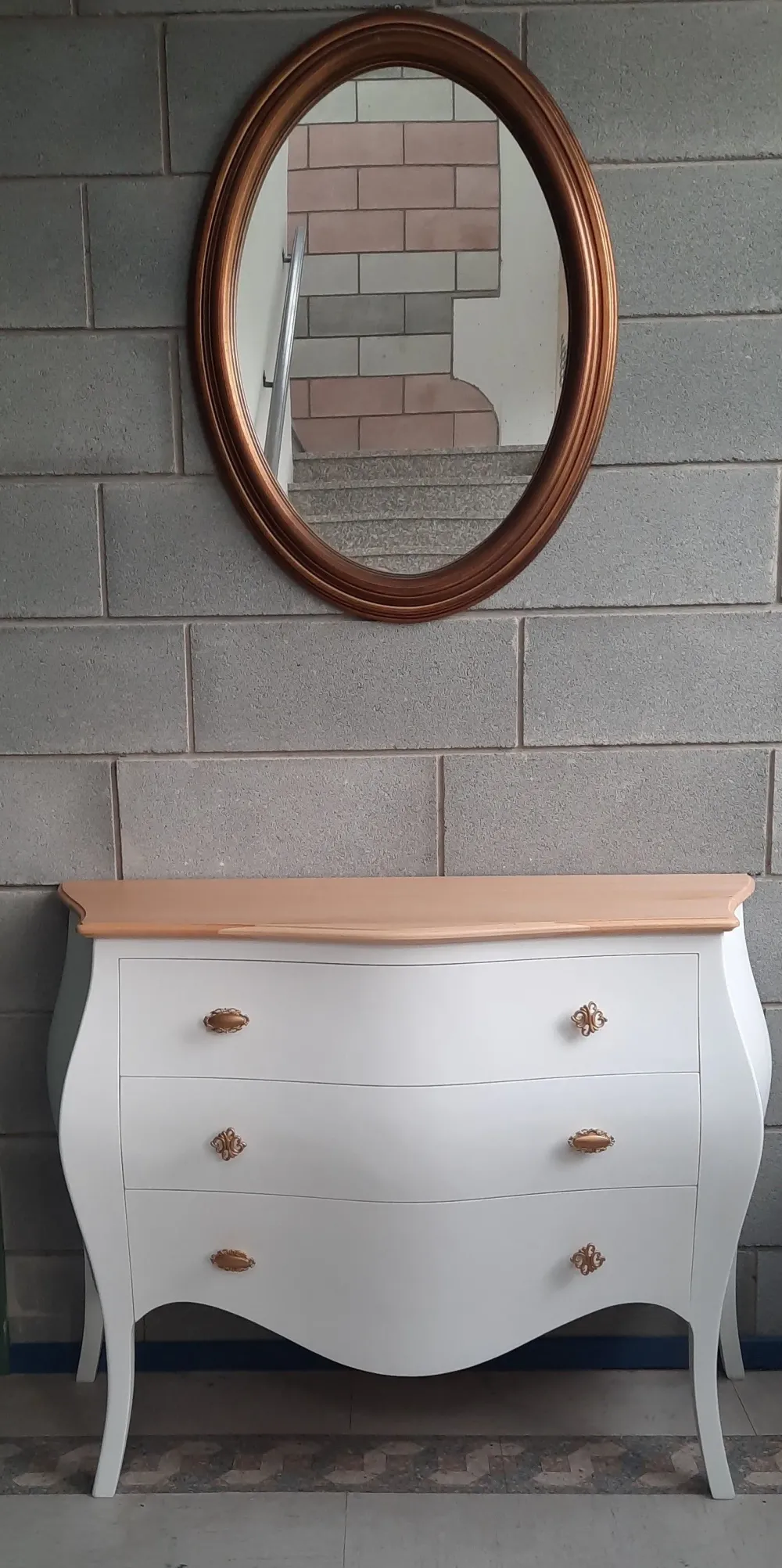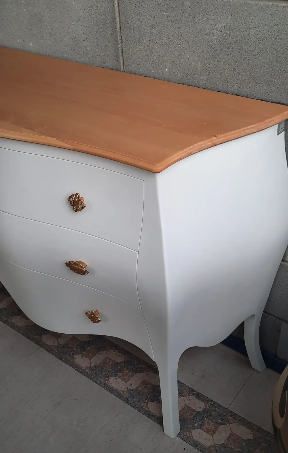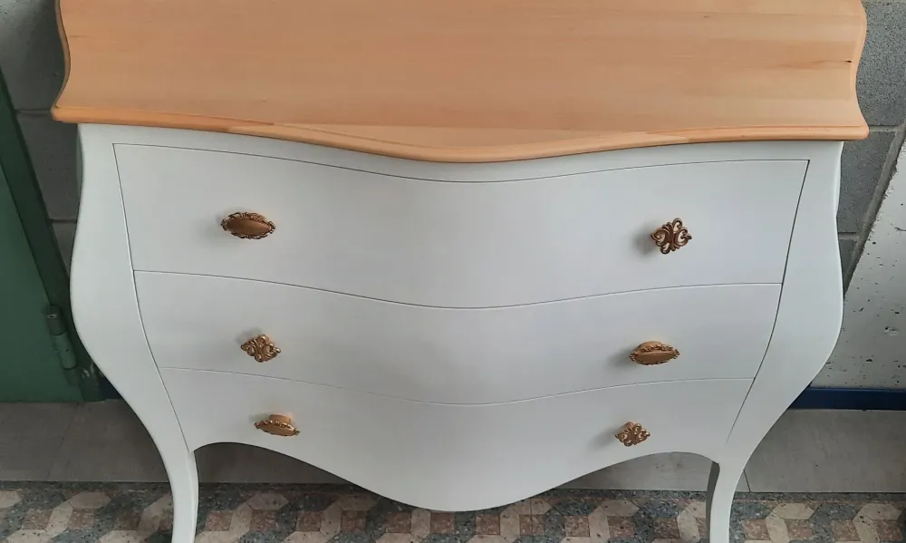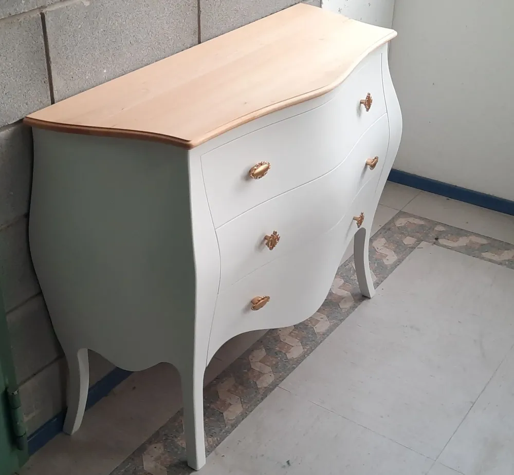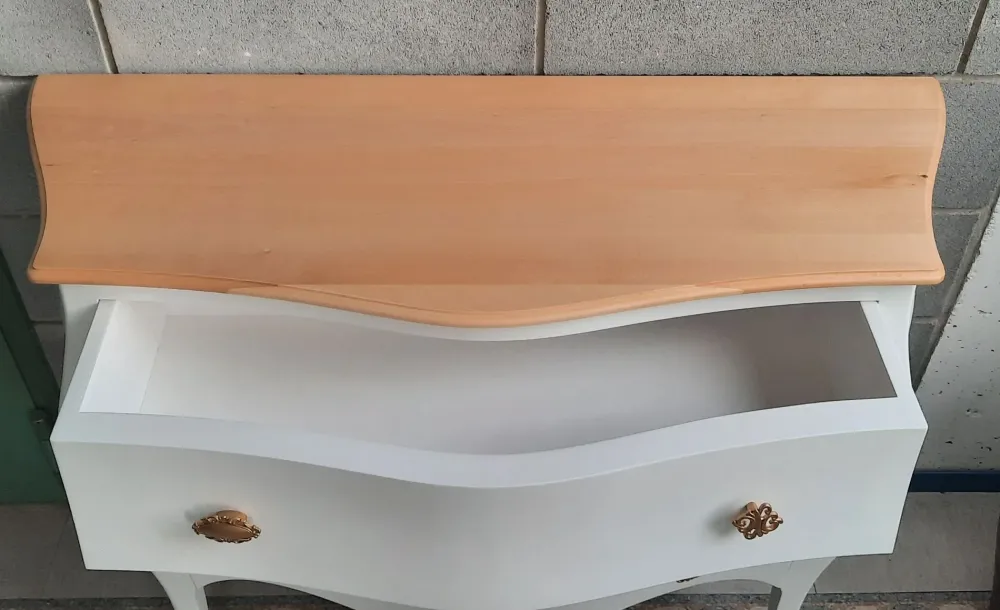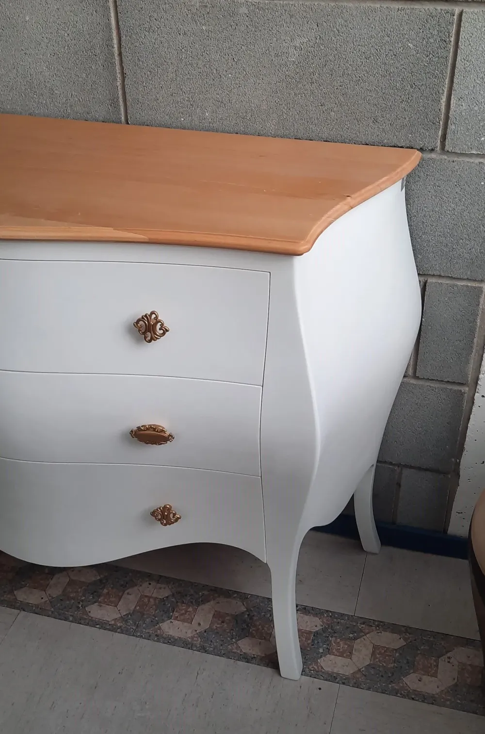 Mobile da ingresso a 3 cassetti artigianale in legno massiccio laccato color bianco zucchero opaco con piano naturale opaco, impreziosito da maniglie color oro satinato di 2 tipologie diverse , finito interamente a mano con colori all’acqua.