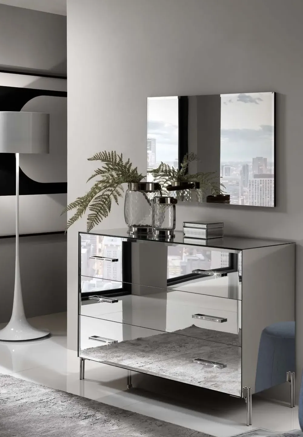 – COMO – Comò FANTASY con specchi molati, piedi cromati e maniglie FANTASY SWAROVSKI, piana e fianchi a specchio