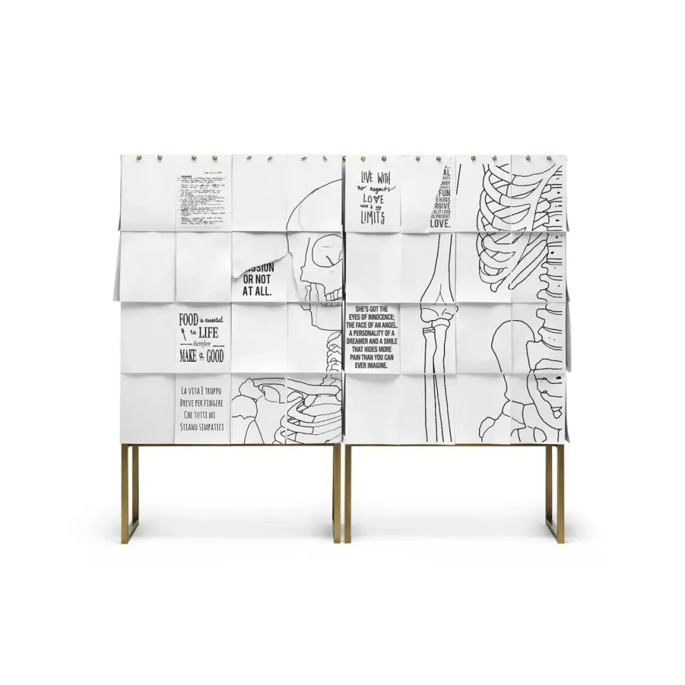 Notes è un contenitore con struttura in mdf Valcromat grigio con fronte e fianchi rivestiti da fogli di carta in formato A4 sovrapposti e intercambiabili. La base è in metallo in finitura bronzo patinato. Per scrivere quello che si desidera: la lista della spesa, un messaggio, una ricetta, Notes può cambiare sempre ed essere sempre unico personalizzato dal suo fruitore. Dimensioni 84x42x150h