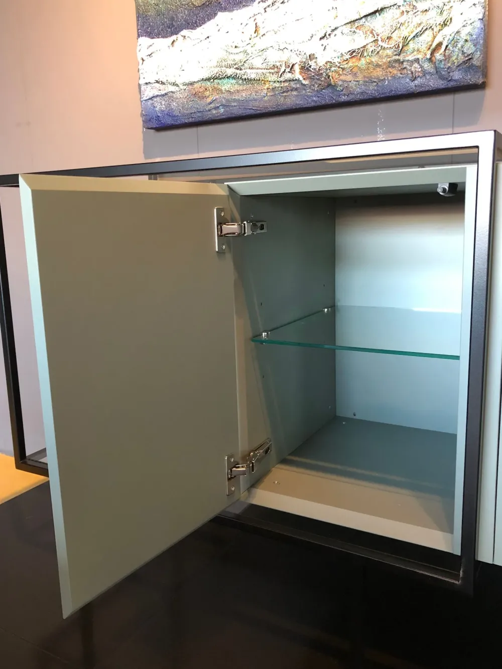 Struttura metallica nera, ante laccate opache verde salvia (RAL 6021), vetro fumè.