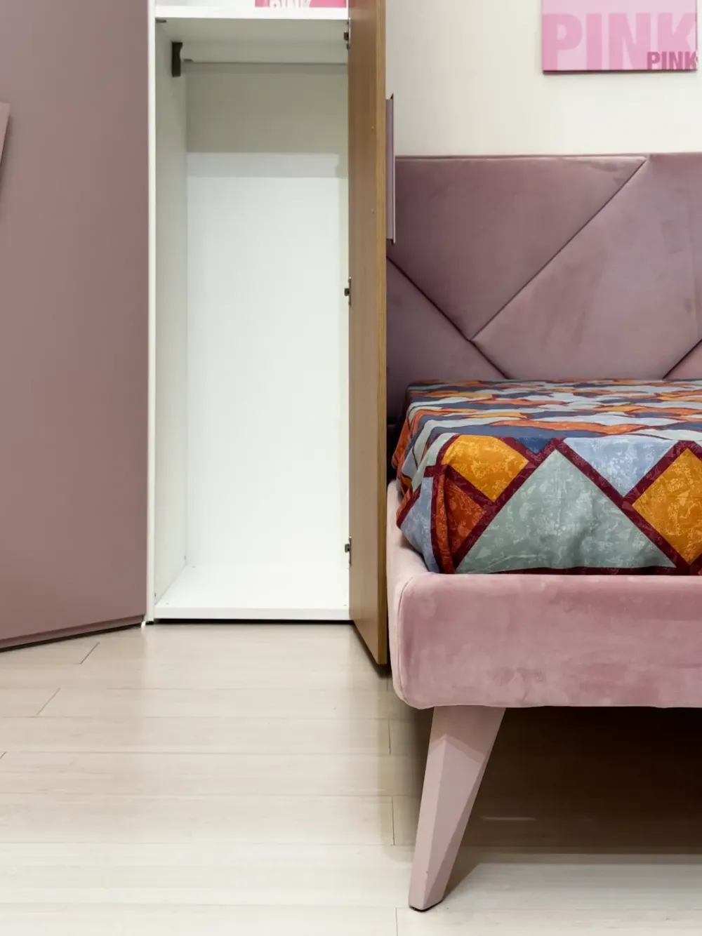 La Cameretta Kids di Moretti dalle finiture in rovere, bianco e peonia è una composizione moderna adatta a bambine e ragazze. La zona studio è caratterizzata da uno scrittoio dalle forme morbide volte a garantire la massima sicurezza grazie al piano sagomato e ai bordi arrotondati. Presenta inoltre un comodo ripiano porta oggetti nel supporto. A completare quest area si aggiunge la sedia imbottita Flap con basamento in metallo finitura alluminio lucido completo di ruote piroettanti e provvisto da sollevamento a gas. Il letto da una piazza e mezza con testiera imbottita Cross realizzata in morbido tessuto color Peonia, presenta quattro gambe modello Queen che lo rendono imponente ed elegante. L armadio angolare con libreria terminale e cabina è dotato di led al suo interno.