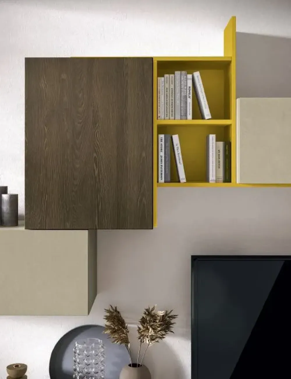 Parete Attrezzata sospesa in finiture Rovere fiammato, argilla materico e senape laccato opaco. Dimensioni: L.285 cm, P. 41 cm, H. 242 cm