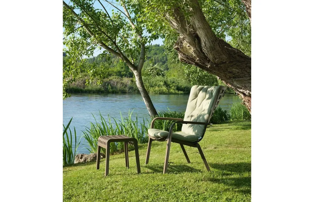 Poltrona reclinabile. Materiale: polipropilene fiberglass trattato anti-UV e colorato in massa. Finitura opaca. Dotata di piedini antiscivolo. Cuscino disponibile su ordinazione. Resina riciclabile.