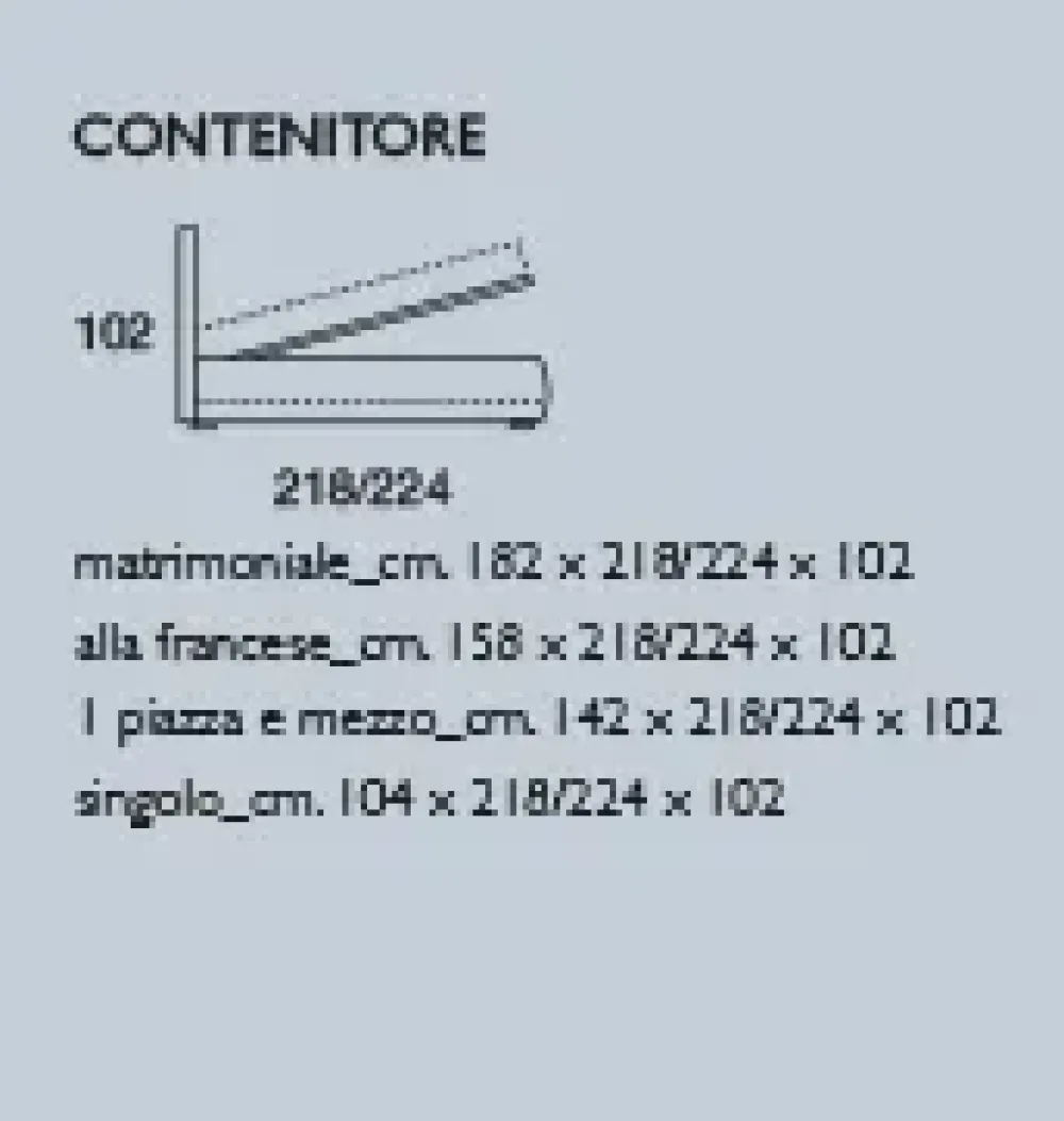 Disponibile nelle dimensioni matrimoniale, alla francese, una piazza e mezzo, singolo e nelle versioni fisso, contenitore e contenitore pratico.