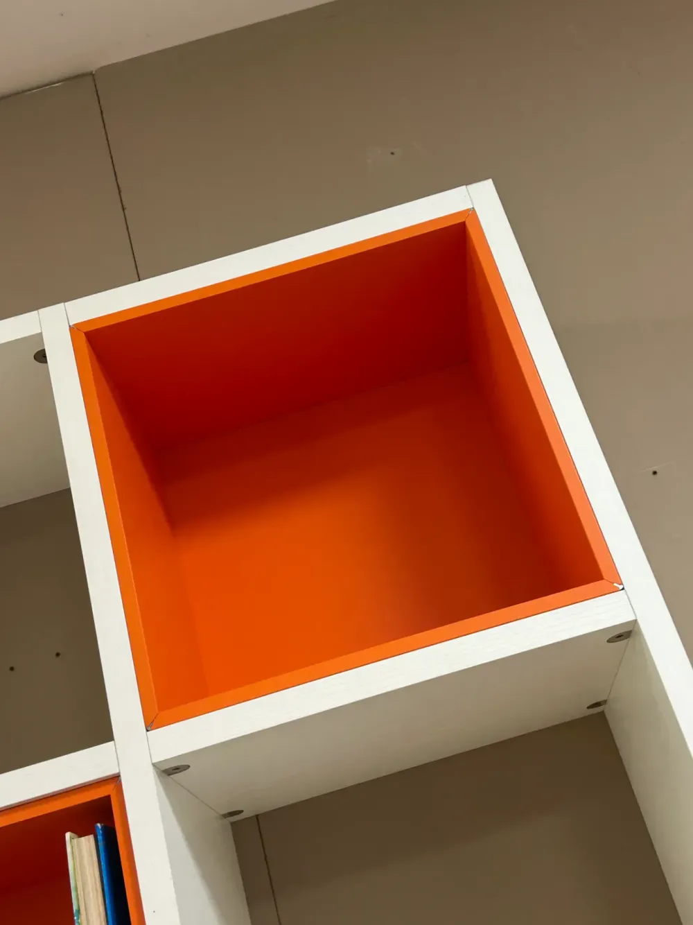 Libreria cubi sospesa doppia profondità, bicolore arancione e bianco.