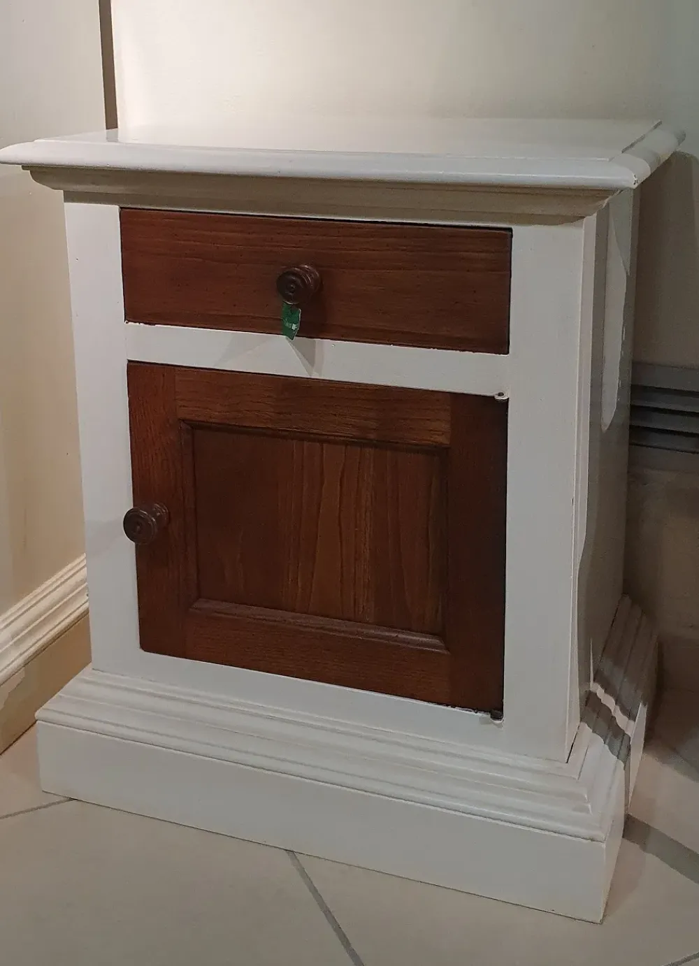 Gruppo comò e comodini di dimensioni generose, le dimensioni del cassettone sono L.131 x p. 57/72 x h. 105 cm mentre quelle dei comodini sono L. 60 x p. 40 x h. 70 cm. il gruppo è caratterizzato da una doppia finitura sia in noce che in un laccato avorio patinato a mano ed entrambi rifiniti a cera. Le dimensioni permettono un ottimo contenimento sia nel cassettone che nei comodini; il cassettone è caratterizzato da un’ampia ribalta nella parte superiore, ribalta caratterizzata da 4 cassetti e un’ansa centrale, i comodini hanno come particolarità la disponibilità di un vano chiuso ad anta ed esiste il comodino con anta destra e quello con anta sinistra, oltre allo sportello hanno anche un comodo cassetto.