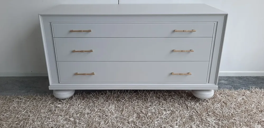 Comò a 3 cassetti completamente in legno , con finitura laccata color cenere opaco , impreziosito da maniglie color oro satinato , zoccolo a cipolla in legno massiccio Misure 134x56x74h POSSIBILITA’ DI AVERLO IN ALTRI COLORI (VEDI SCHEDA ALLEGATA) TRASPORTO IN TUTTA ITALIA INCLUSO NEL PREZZO (ISOLE CON SUPPLEMENTO)