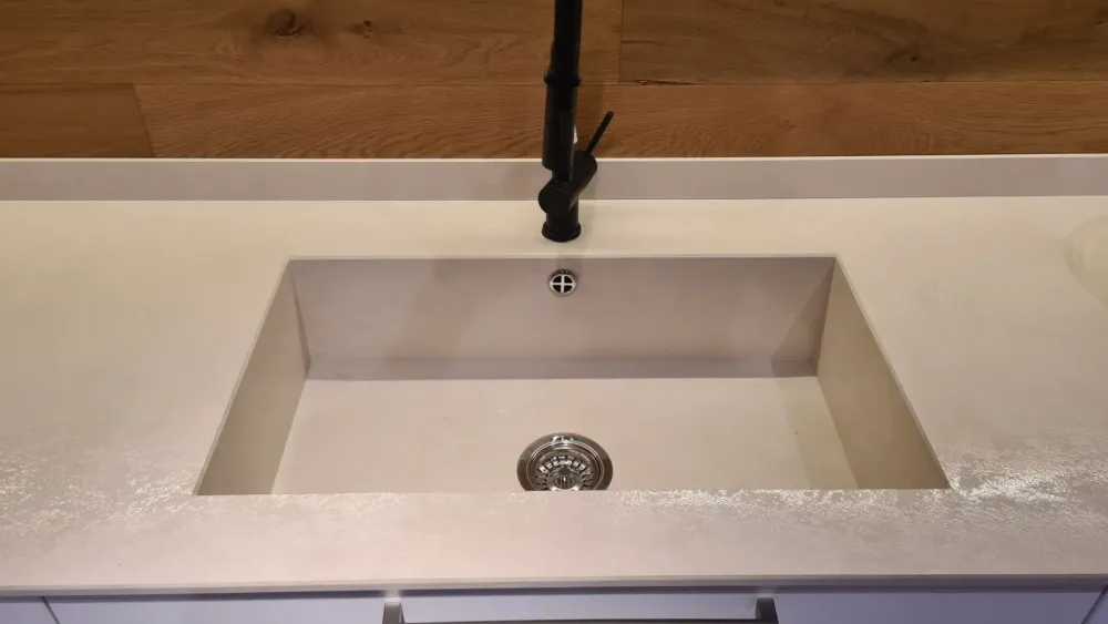 Cucina in PET colore bianco, con top in GRESS e lavello integrato