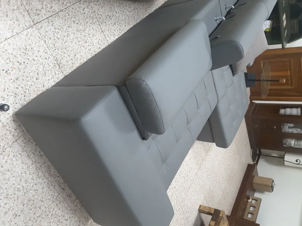 Divano con schienale reclinabile nella parte alta per facilitare il comodo appoggio della testa di chi si siede. Composizione da cm 240 x 160. Rivestito in ecopelle GRIGIO non sfoderabile. Completamente trasformabile, penisola alzabile con contenitore sotto, e parte sotto il divano lungo apribile in avanti con letto estraibile per formare un piano unico. Il prezzo non comprende il trasporto, preferito ritiro diretto. 2 Colli tot.mc 2,70, Ultima composizione disponibile.