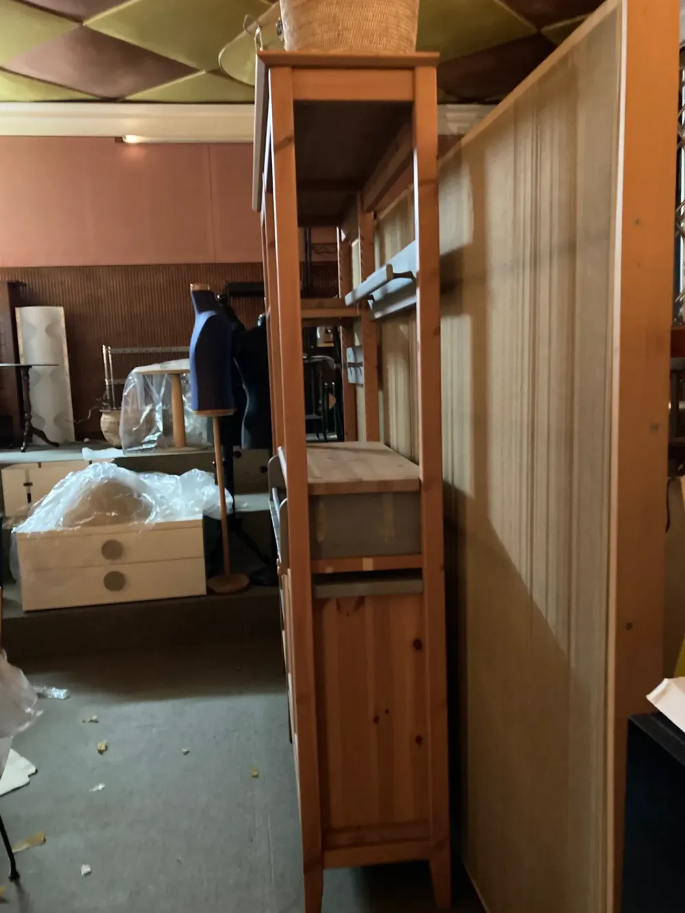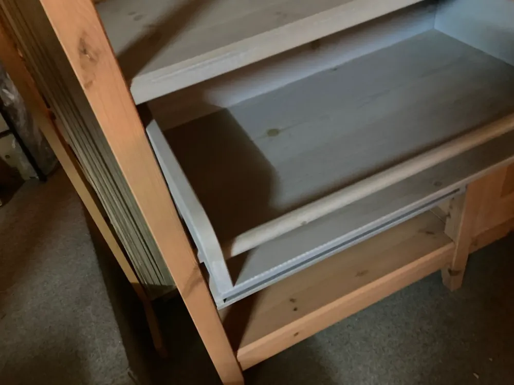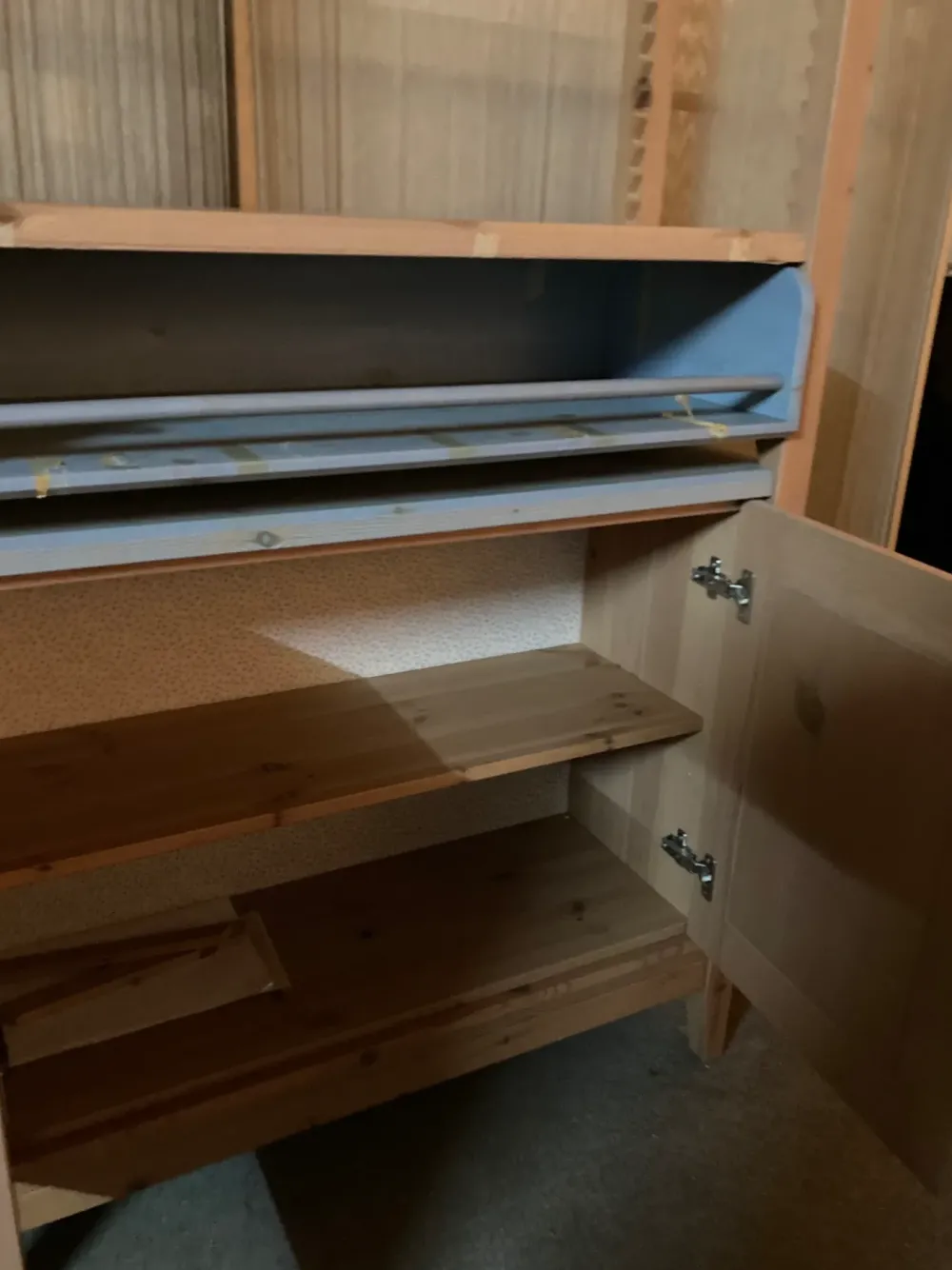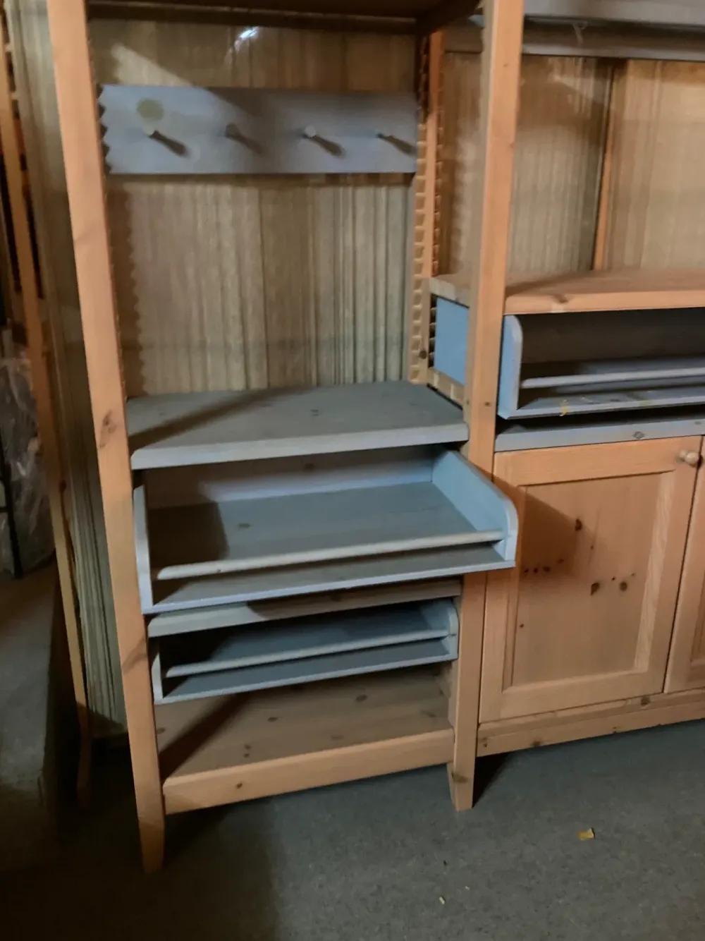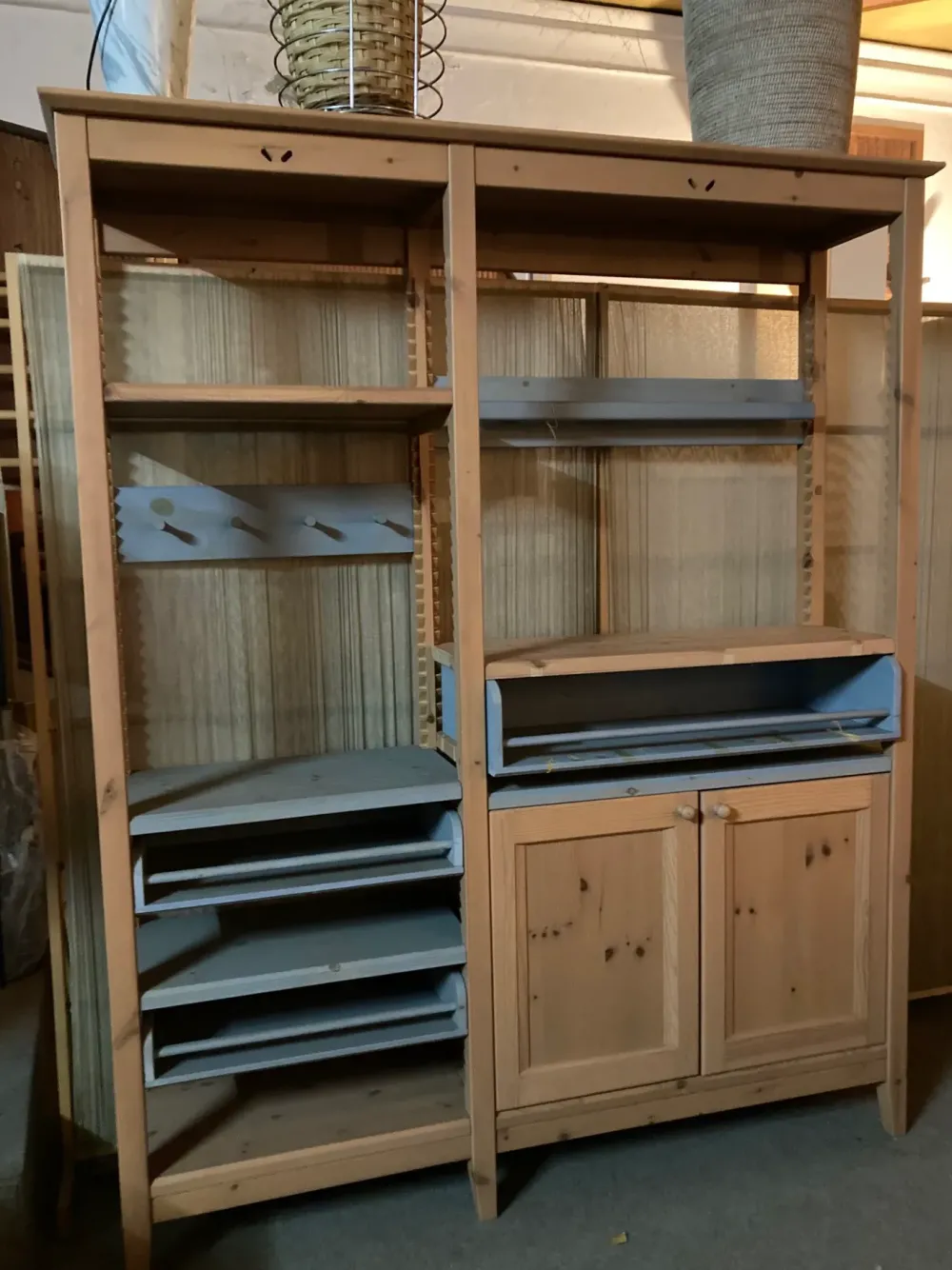 Scaffale Omnia in massello di larice tinto tortora e azzurro