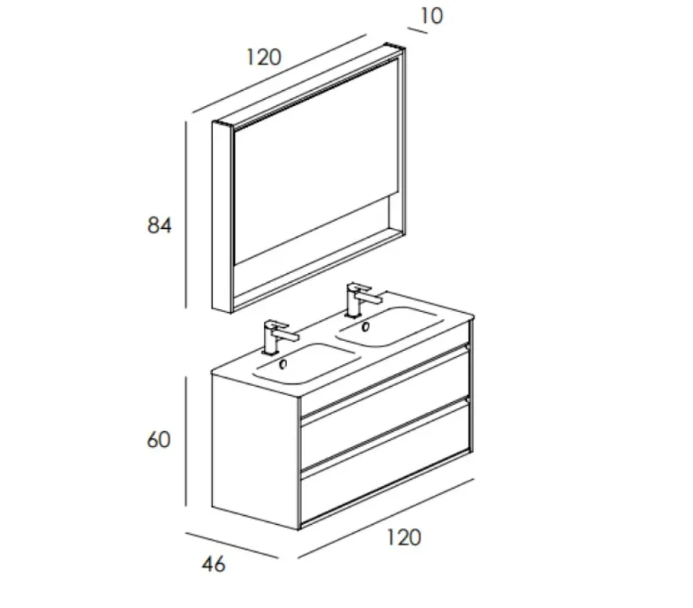 Questa meravigliosa composizione include il Mobile bagno Smart.46 Next 18 con due cassetti in laminato con finiture color legno Noce Fumè e gola Titanio L.120 x 46p.x 60h. con doppio lavabo in ceramica opaca Mat Ceramic e il grande specchio mod.Gioia L.120 x p.10 x h.84 cm. con luce LED riflessa sul fondale che verrà realizzato di un colore RAL disponibile a vostra scelta. La struttura dello specchio in finitura color legno Noce fumè, diventa anche una pratica mensola di arredo.