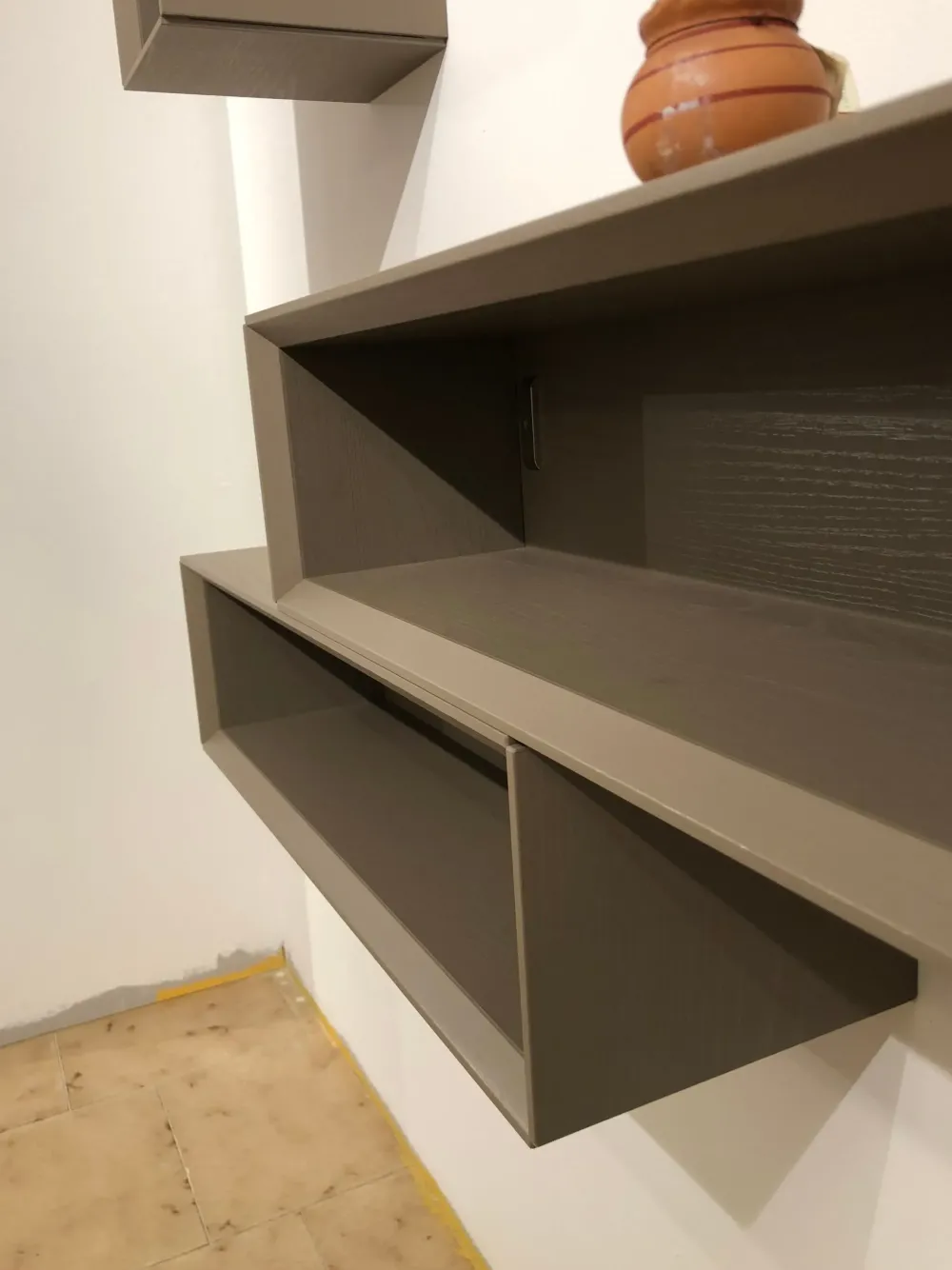 Composizione formata da 2 vani giorno orizzontali da 60*h17 profondi 20 cm, un elemento verticale delle stesse misure ma con 2 ripiani in vetro e 2 specchiere da 89*20 su pannello in tinta con i mobili.