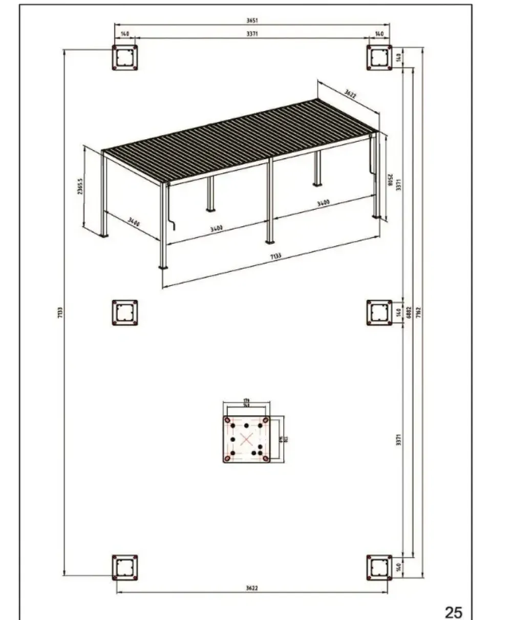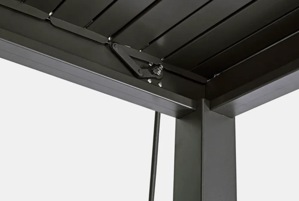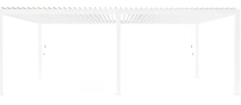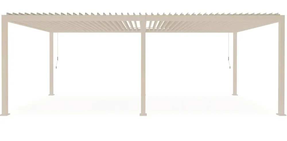 Alluminio verniciato a polvere (poliestere). pali portanti 111x111mm, traversi 140x75mm. tetto lamellare orientabile tramite due manovelle. ogni manovella consente il movimento indipendente del singolo settore. lame frangisole a doppio strato 173x30mm. sistema di deflusso dell’acqua integrato all’interno dei pali portanti. viteria in acciaio inossidabile.