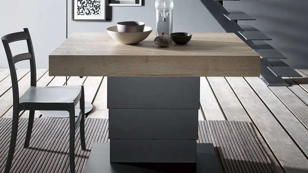 Tavolino trasformabile in tavolo da pranzo, struttura centrale in acciaio.