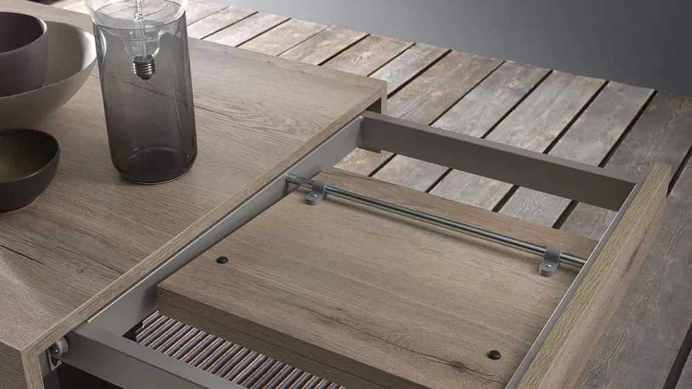 Piano rettangolare in nobilitato, laccato, legno o effetto malta con due prolunghe interne a libro coordinate al piano.