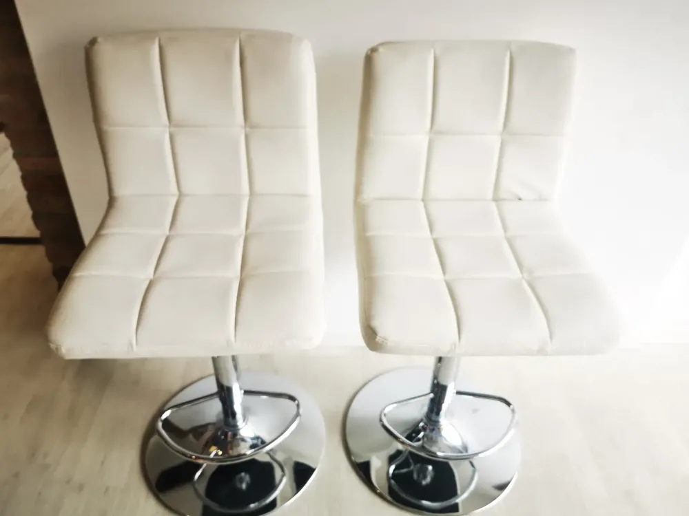 Eleganti e moderni questi due sgabelli sono perfetti per cucina, isola o bancone. Rivestiti in ecopelle bianca di alta qualità, sono dotati di comodo schienale e sistema di regolazione in altezza tramite pistone.