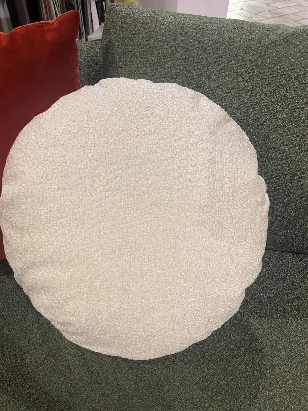 è di forma circolare con imbottitura in misto piuma, sfoderabile