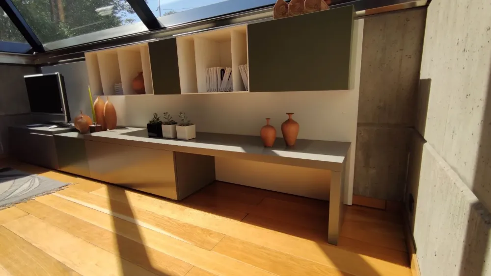 Finitura laminato super matt, laccato opaco color foglia e laccato opaco color fango