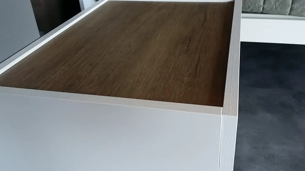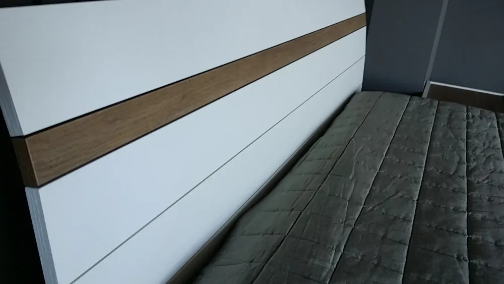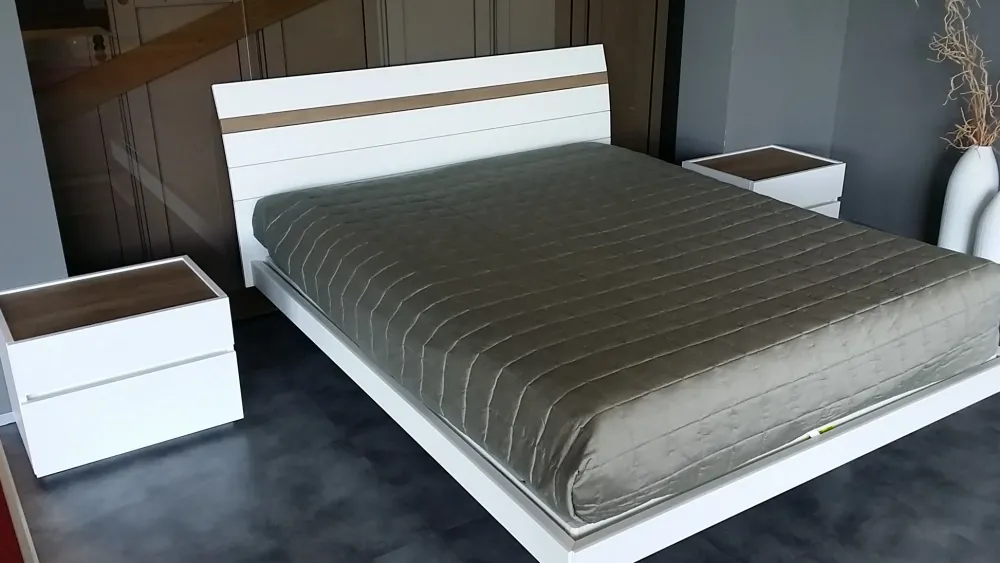 – letto Jocker in finitura mt. poro aperto bianco con inserto testiera in mt. nodato chiaro cm. 176x207prof.x96h.